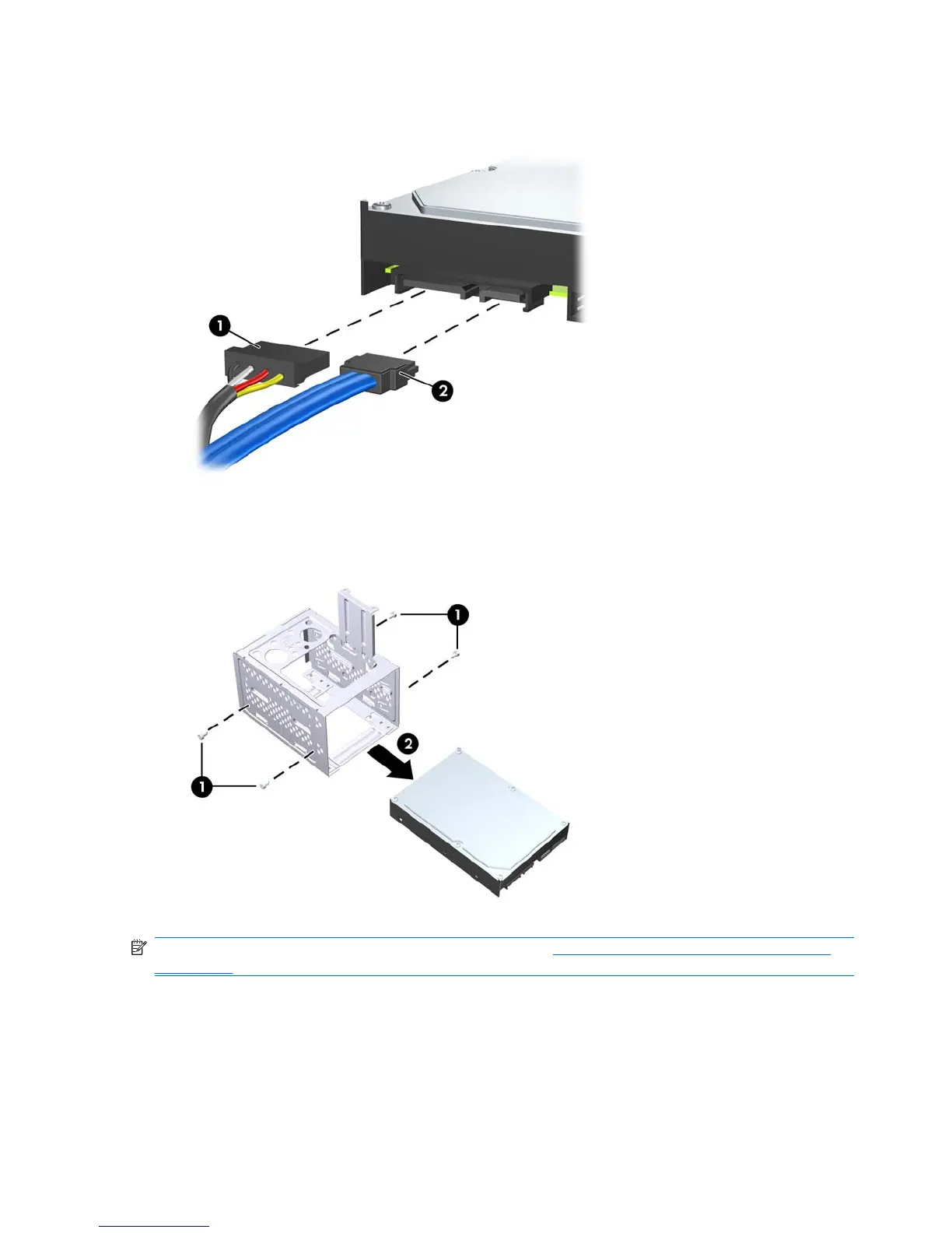 6. Disconnect the power cable (1) and data cable (2) from the back of the hard drive.