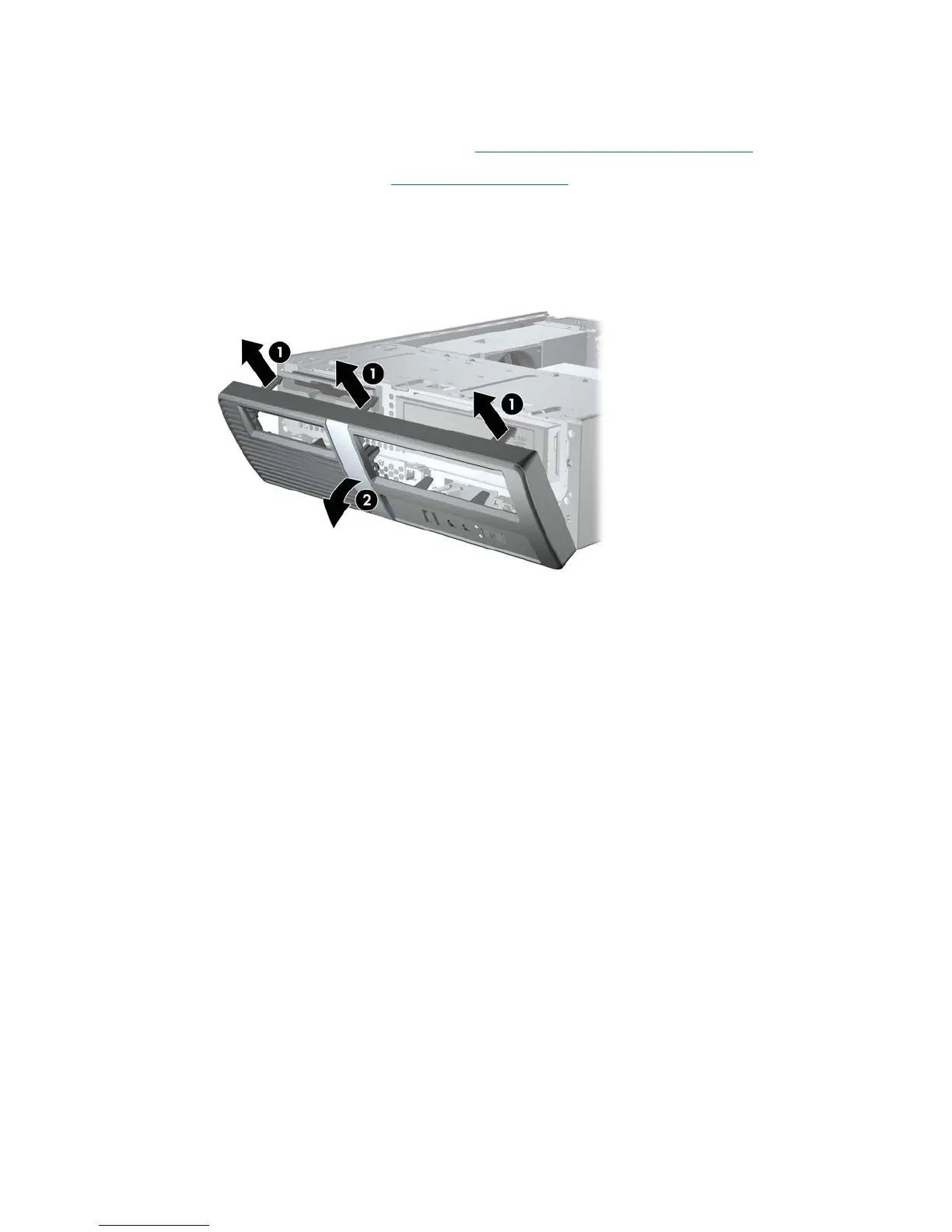3. To remove the front bezel, pull up on each of the three tabs on the top of the bezel (1) to release