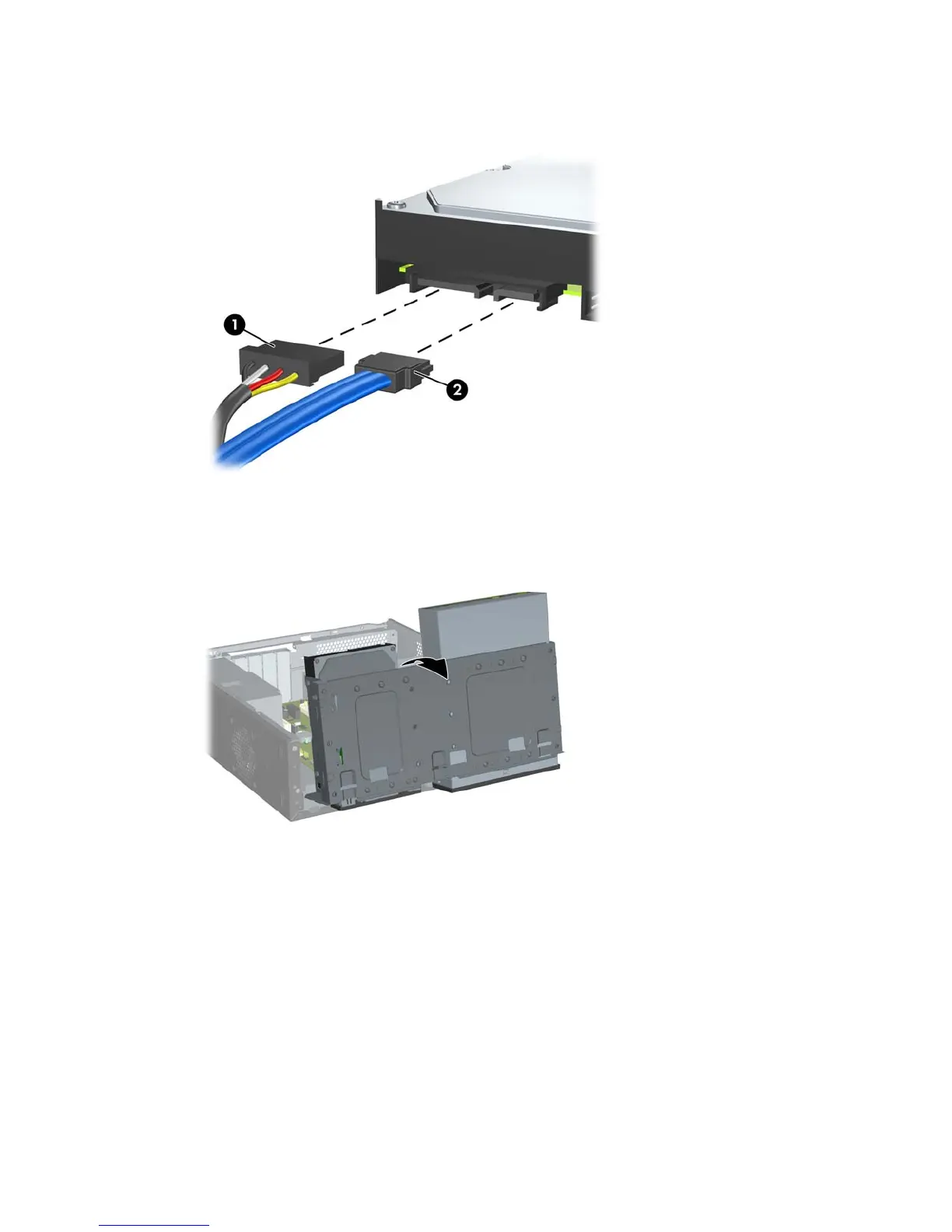 6. Disconnect the power cable (1) and data cable (2) from the back of the hard drive.