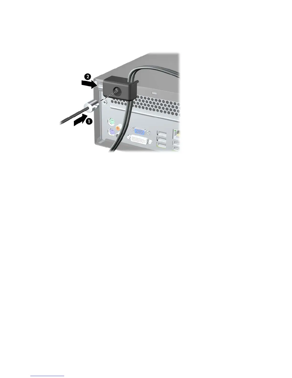 4. Insert the plug end of the security cable into the lock (1) and push the button in (2) to engage the