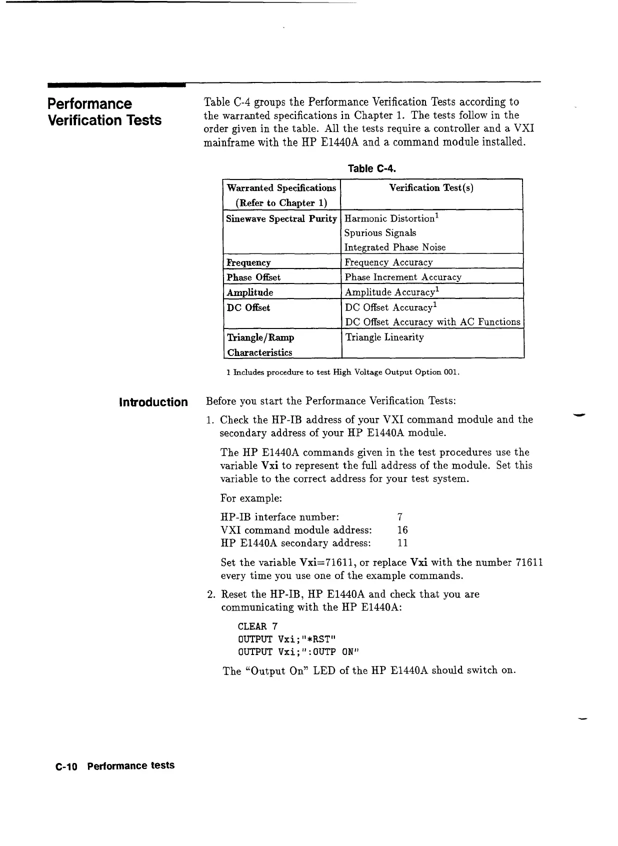 The HP E1440A commands given in the test procedures use the