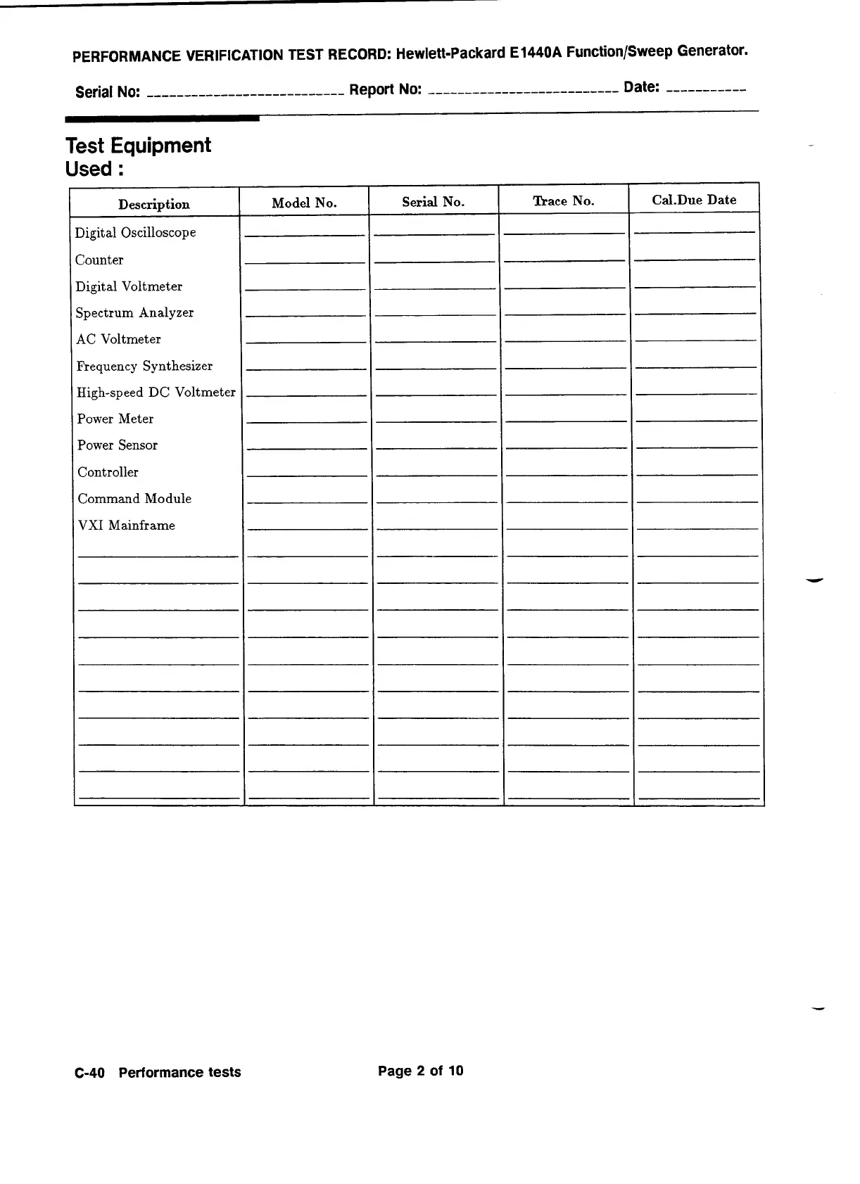 PERFORMANCE VERIFICATION TEST RECORD: Hewlett-Packard E1440A Function/Sweep Generator.