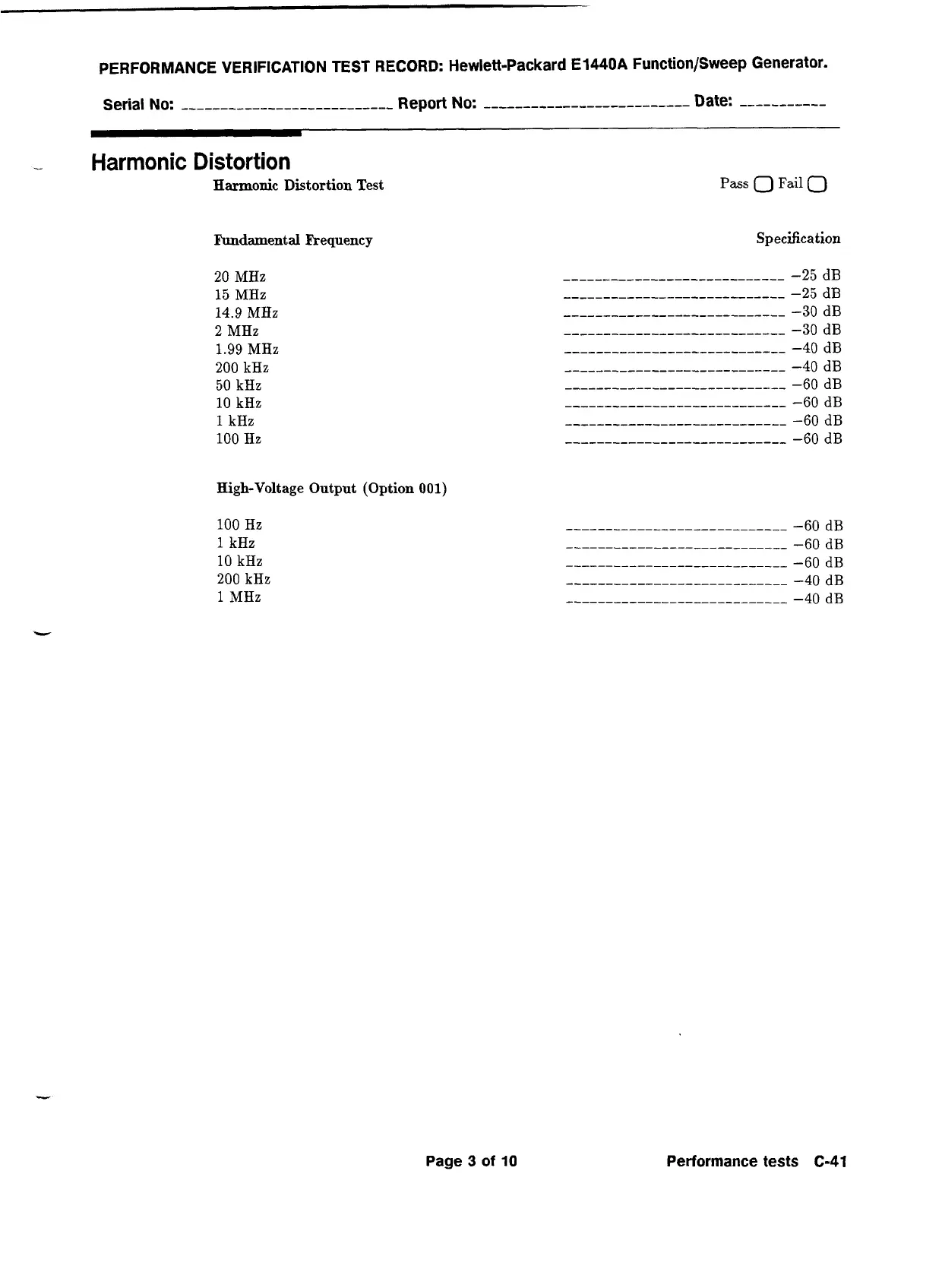 PERFORMANCE VERIFICATION TEST RECORD: Hewlett-Packard E1440A Function/Sweep Generator.
