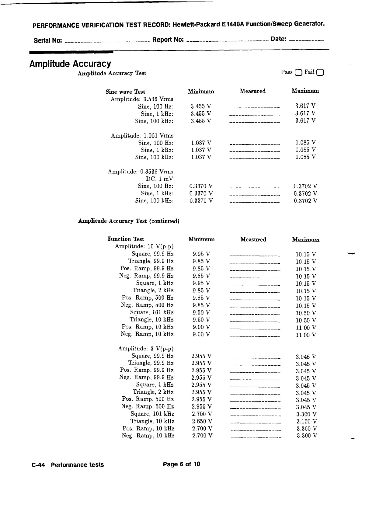 PERFORMANCE VERIFICATION TEST RECORD: Hewlett-Packard E1440A Function/Sweep Generator.
