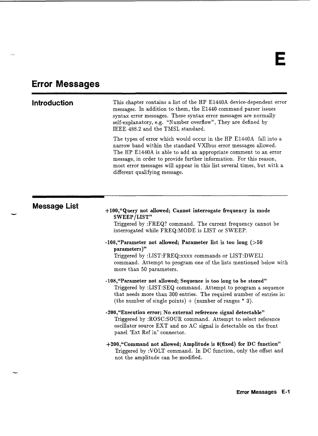 list of the HP E1440A device-dependent error