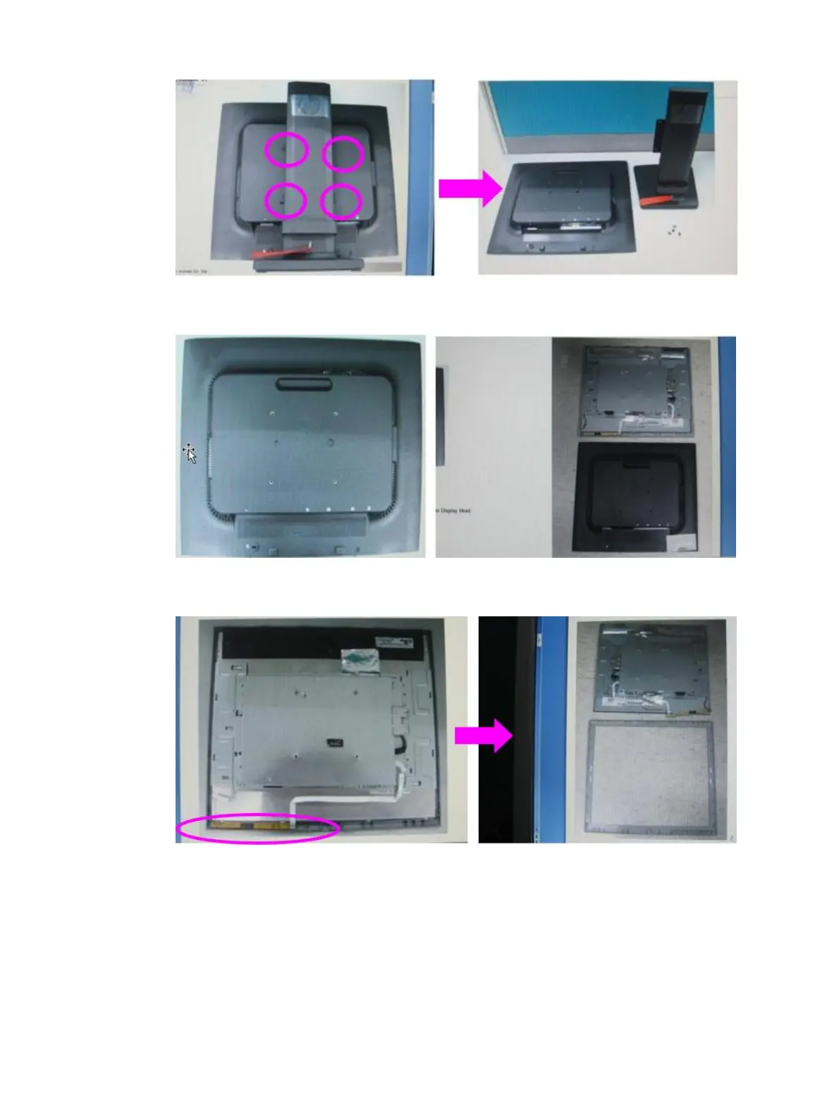 4) Remove 4pcs screw for unlocking the bracket with panel. Tear off AL tape and disconnect LVDS cable..
