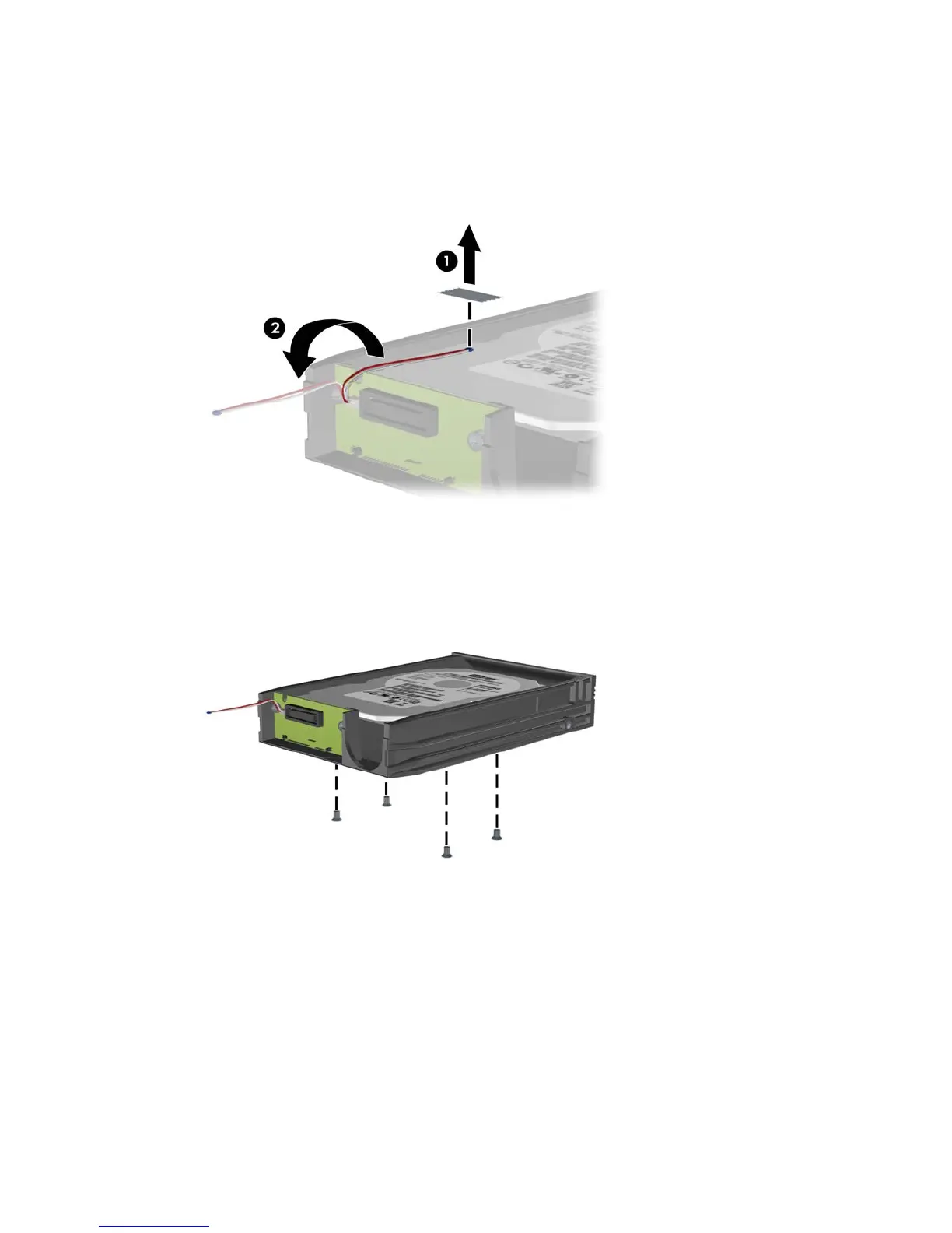 3. Remove the adhesive strip that secures the thermal sensor to the top of the hard drive (1) and