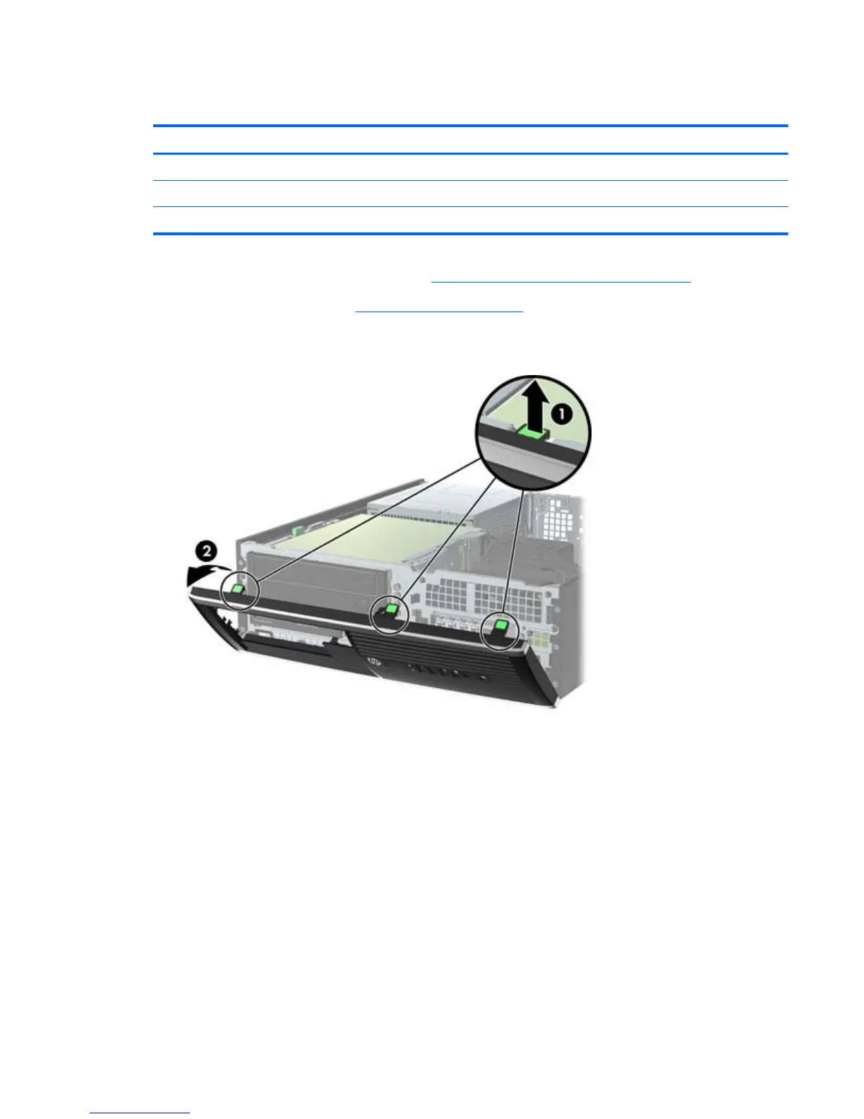 3. Lift up the three tabs on the side of the bezel (1), then rotate the bezel off the chassis (2).