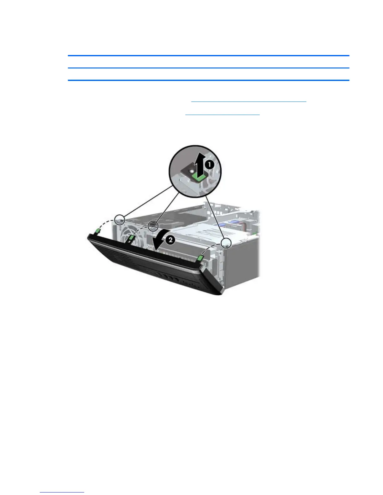 3. Lift up the three tabs on the side of the bezel (1), then rotate the bezel off the chassis (2).