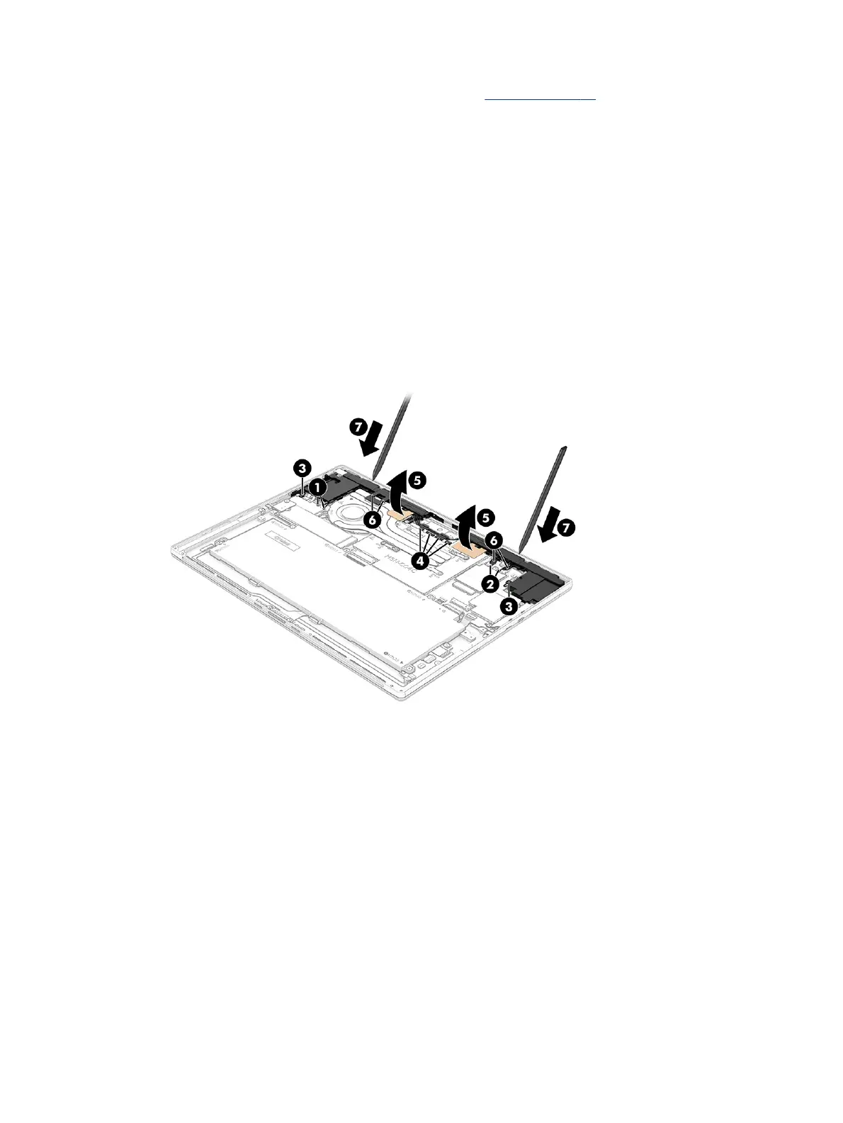 7. Use a tool to release the left speaker from the adhesive that secures it (7), and remove the speakers