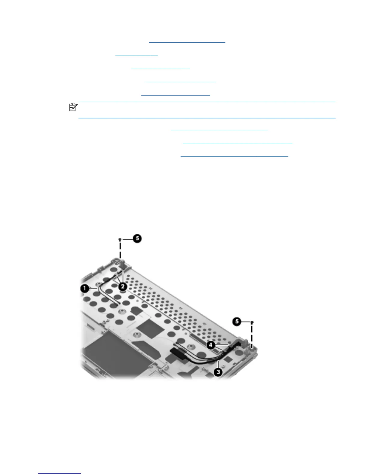 Release the left-side wireless antenna cables (1) from the clips (2) and routing channel built into