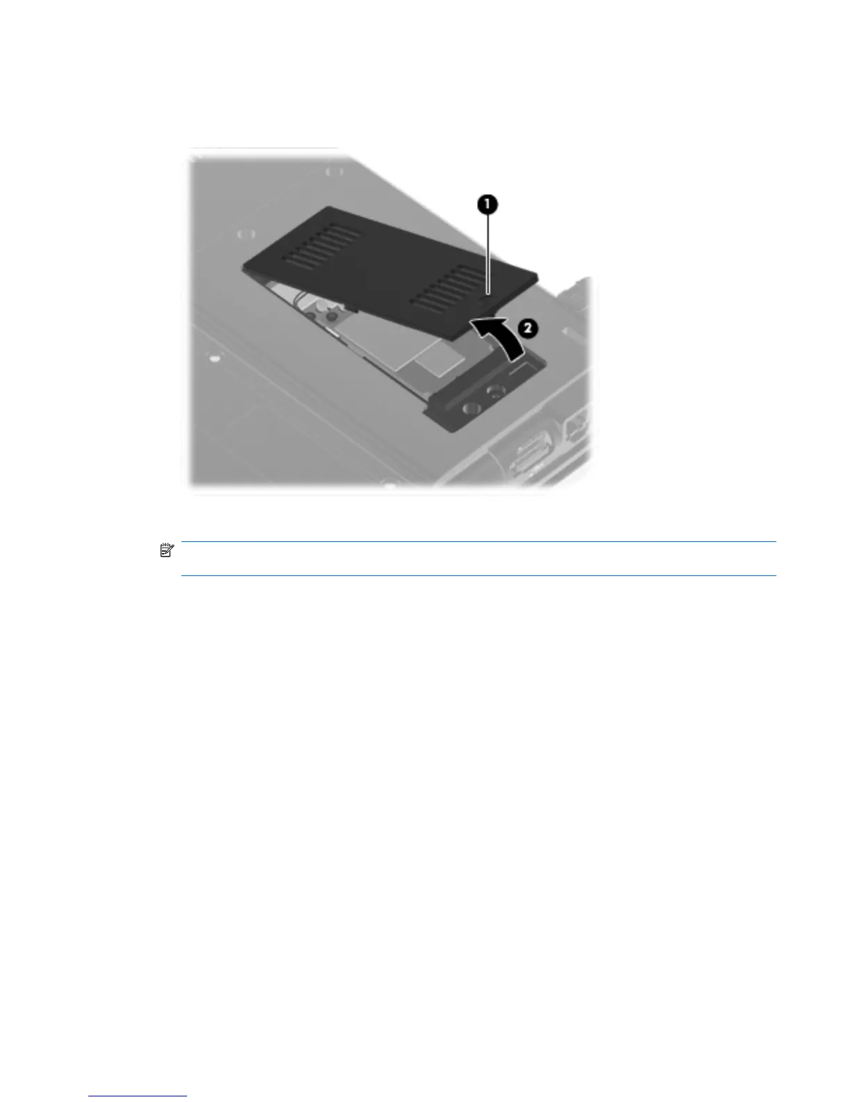 2. Lift the right edge of the wireless module compartment cover (2), swing it up and to the left, and