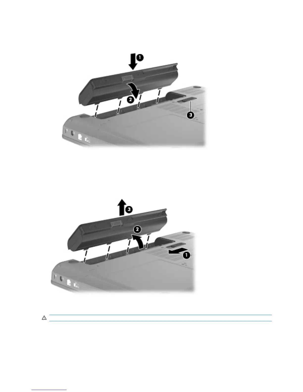 the battery downward (2) into the battery bay. The battery release latch (3) automatically locks the
