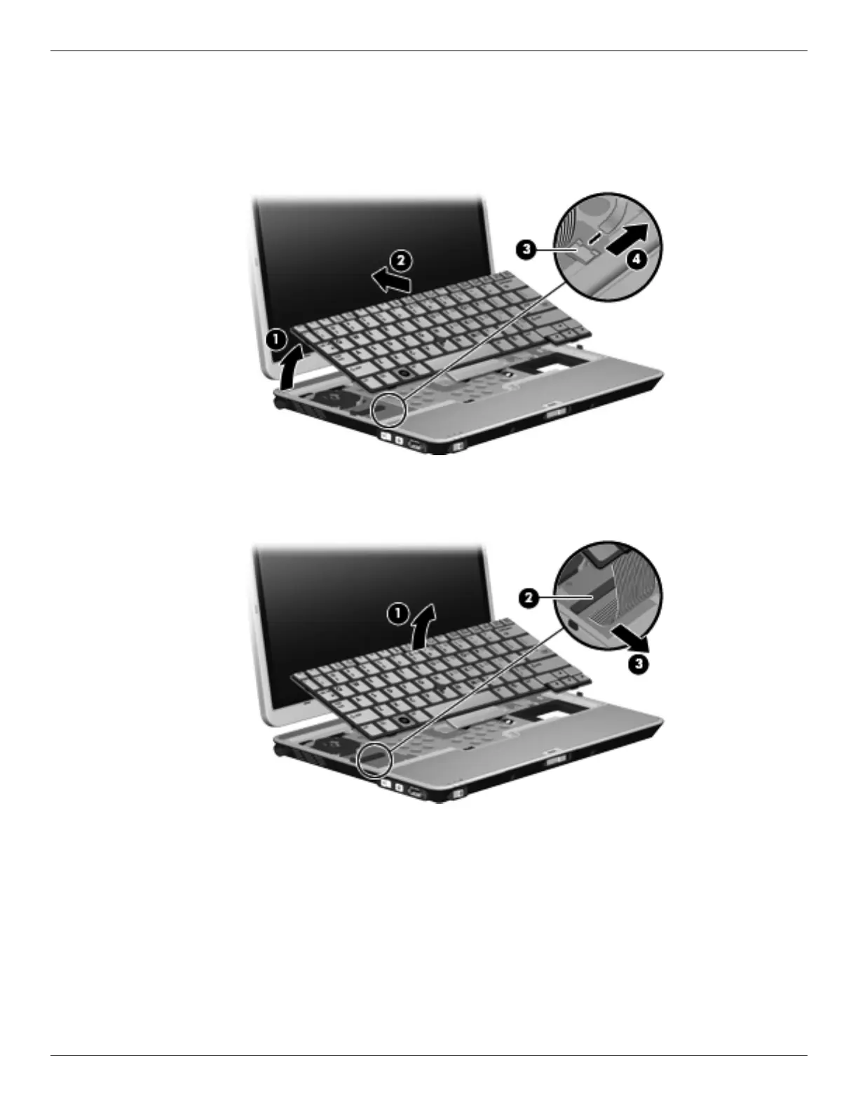 4. Lift the rear edge of the keyboard 1 and slide it 2 back until the pointing stick cable is accessible.