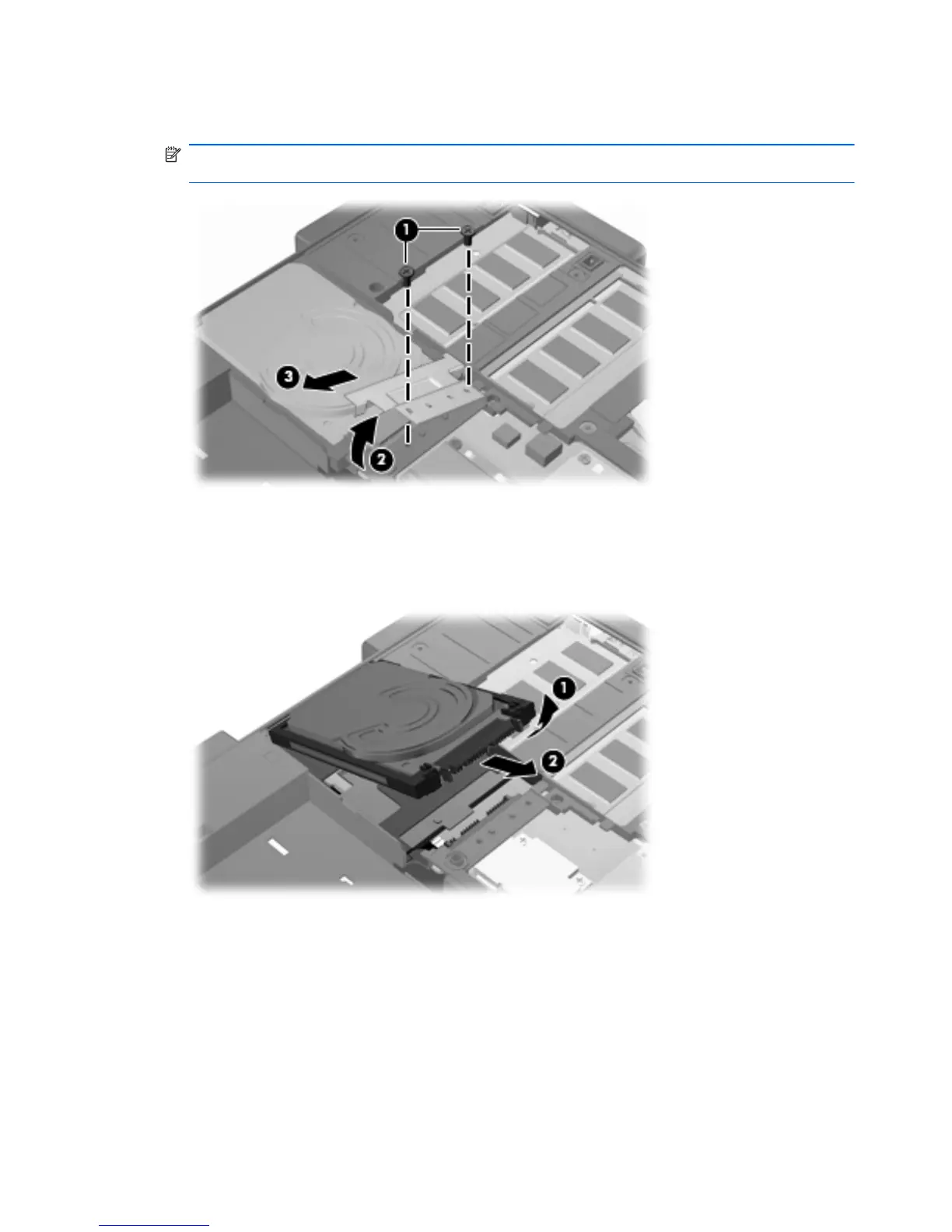 6. At the corner of the hard drive, pull the drive up (1) until it rests at an angle.
