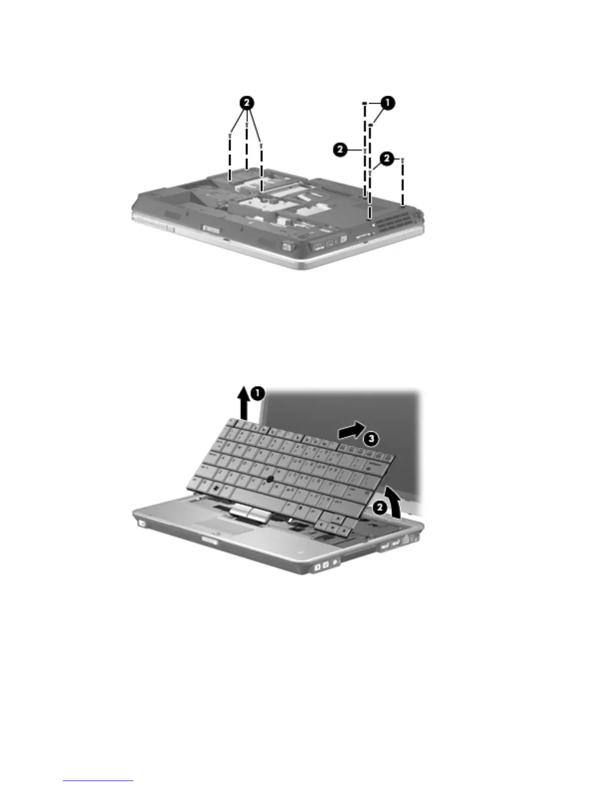 keyboard up until it rests at an angle (2), and then lift the keyboard up enough to gain access to