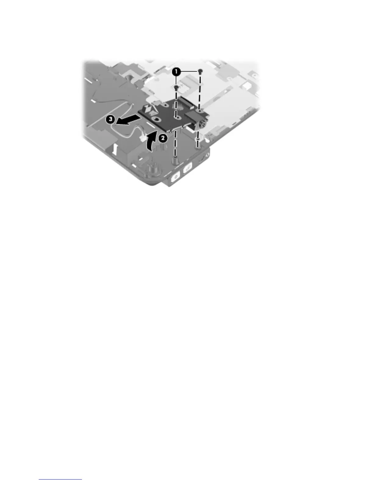 5. Lift the board (2) up at an angle, then slide the board toward the front of the computer (3) until it