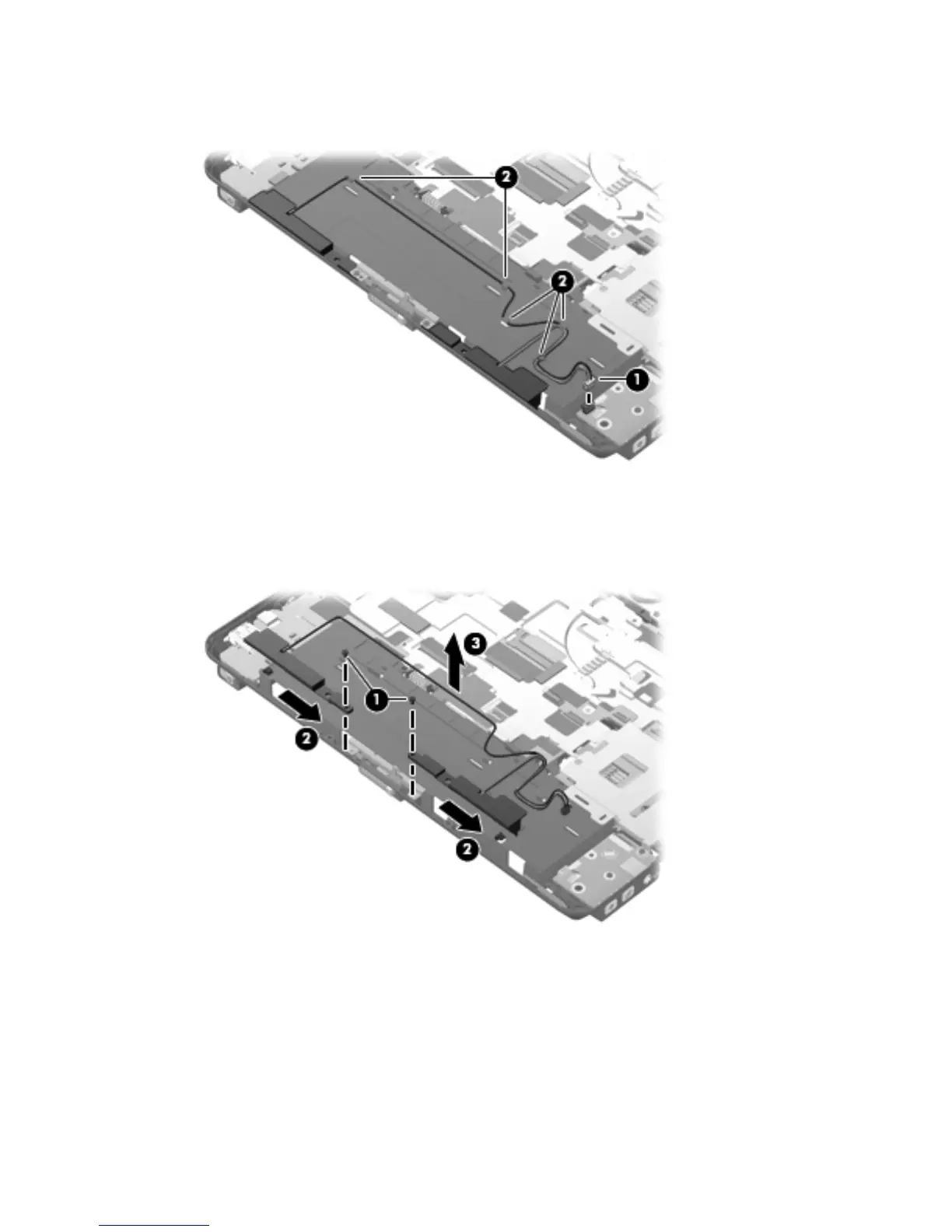 2. Unplug the speaker cable (1) from the audio connector board, and note the routing channel (2)