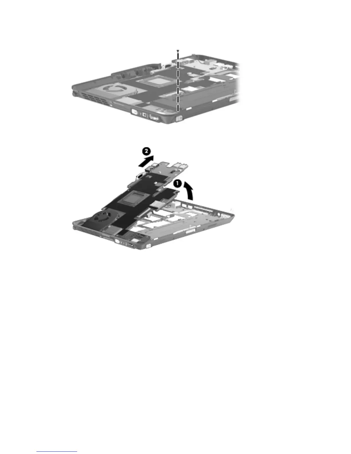 5. Lift the right side of the system board (1), and then lift it out of the base enclosure (2).