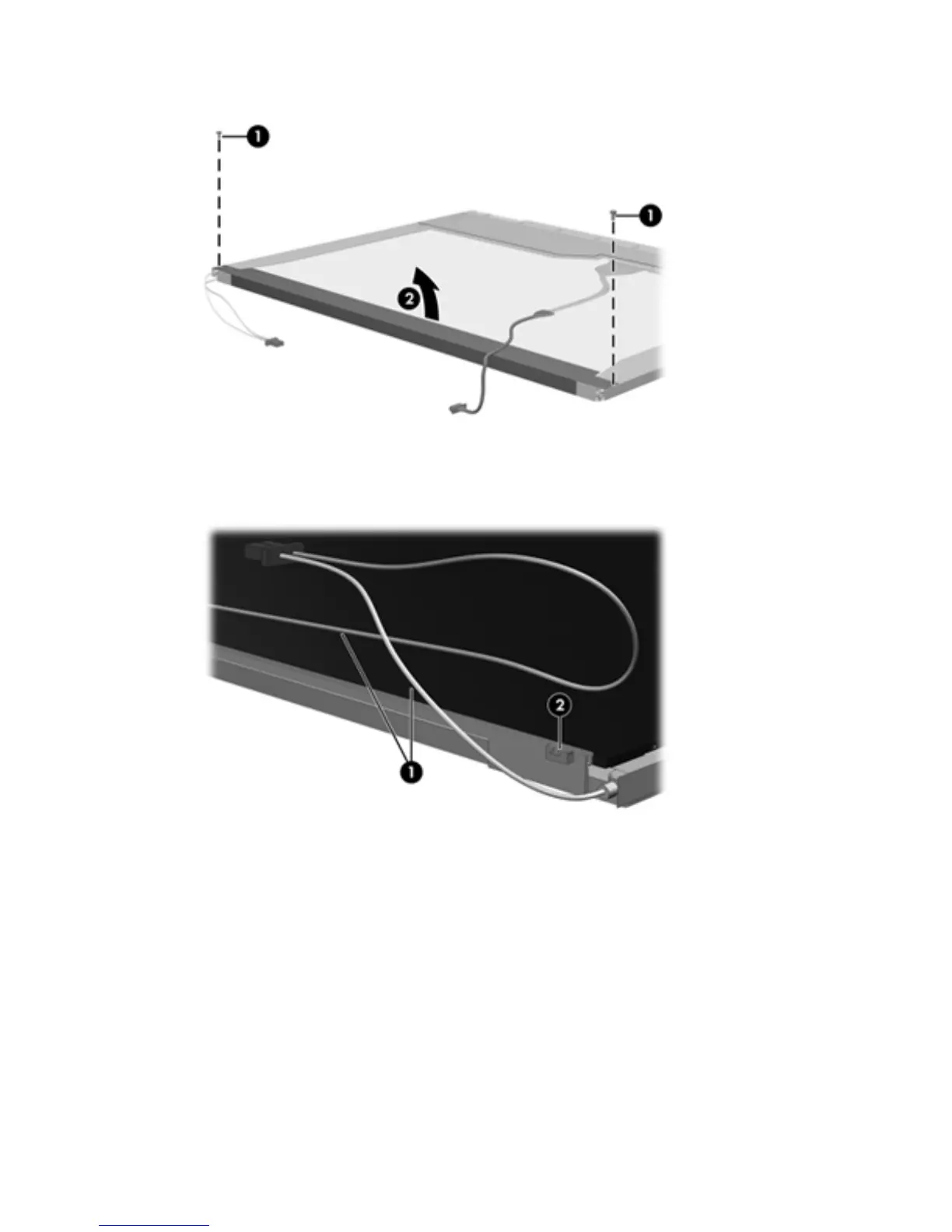 15. Remove the backlight cables (1) from the clip (2) in the display panel.