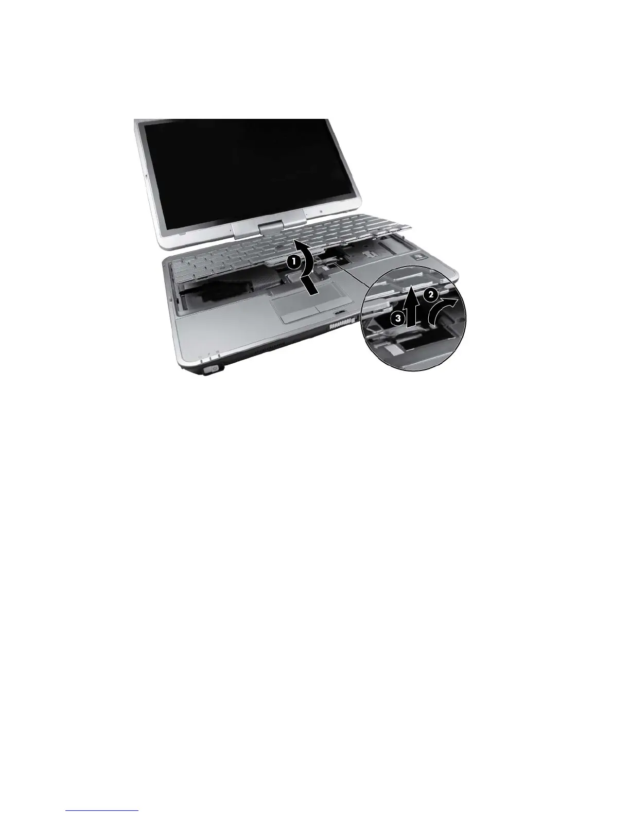 6. Holding the keyboard at an angle, lift the keyboard (1) far enough to gain access to the cables