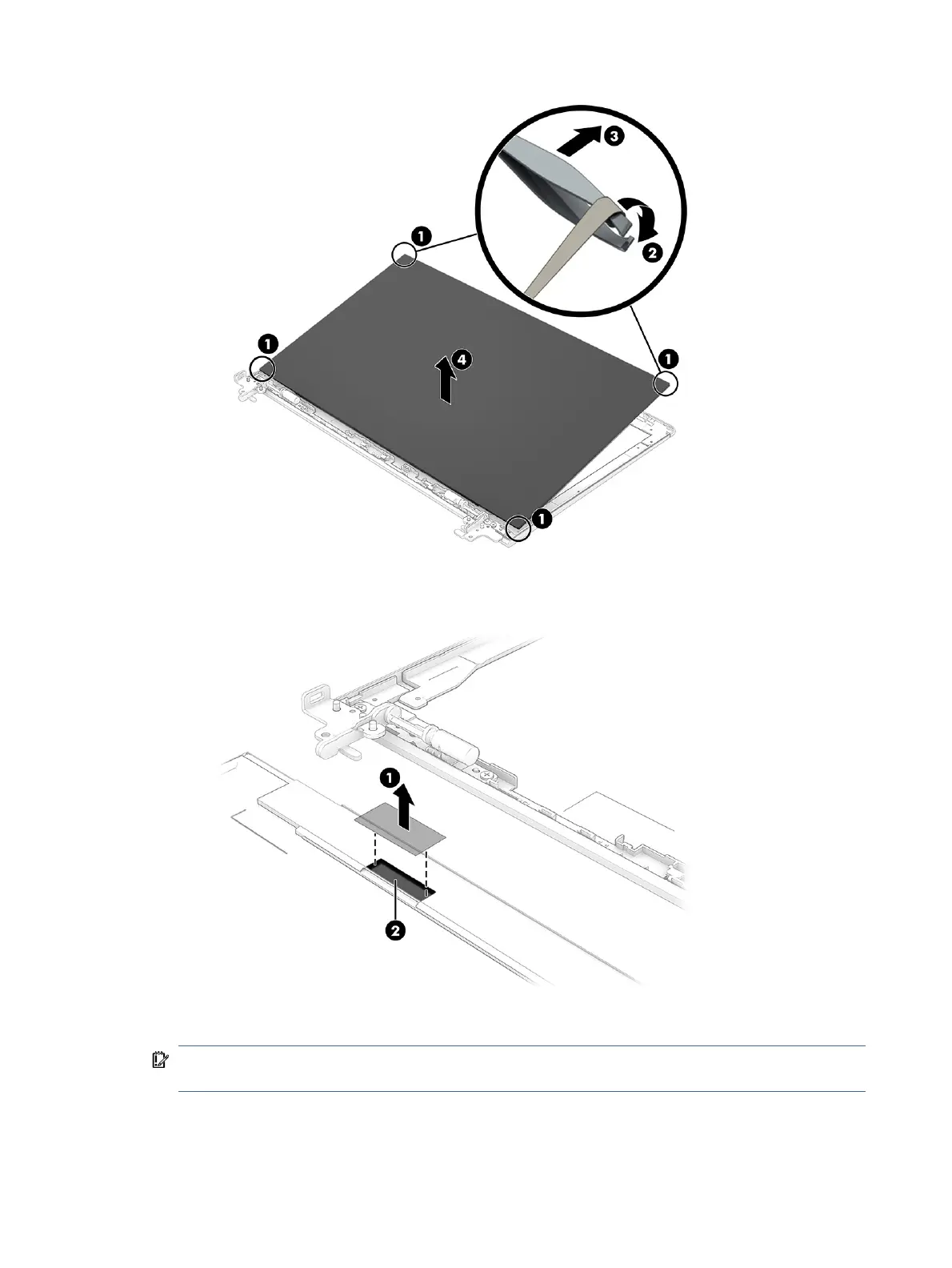 c. Lift the tape from the connector on the display panel (1), and then disconnect the cable from the