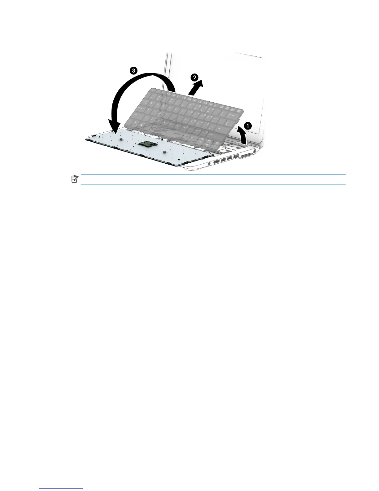 8. Swing the rear edge of the keyboard (3) up and forward until it rests upside down on the palm rest.