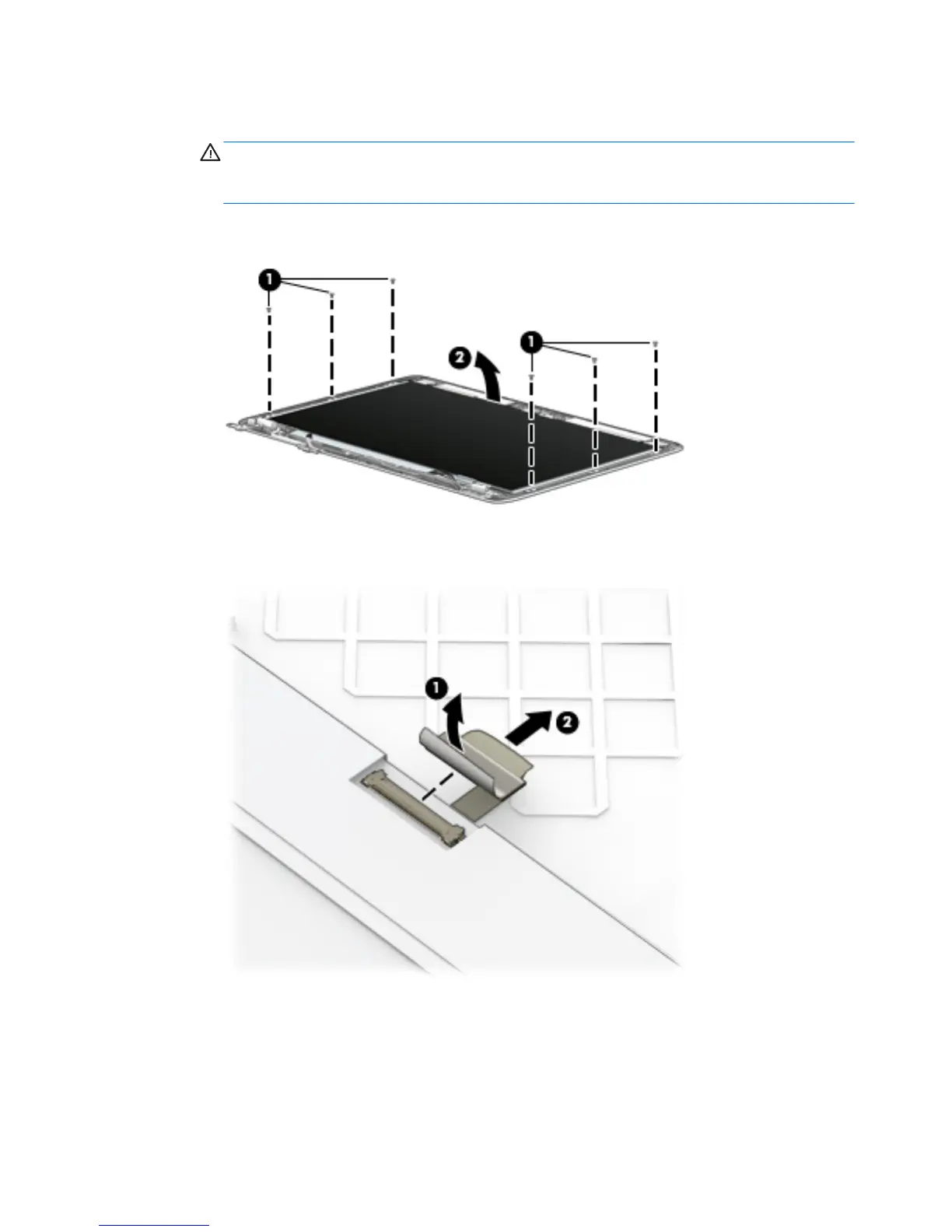 b. Lift the top edge of the display panel (2) and swing it up and forward until it rests upside down in