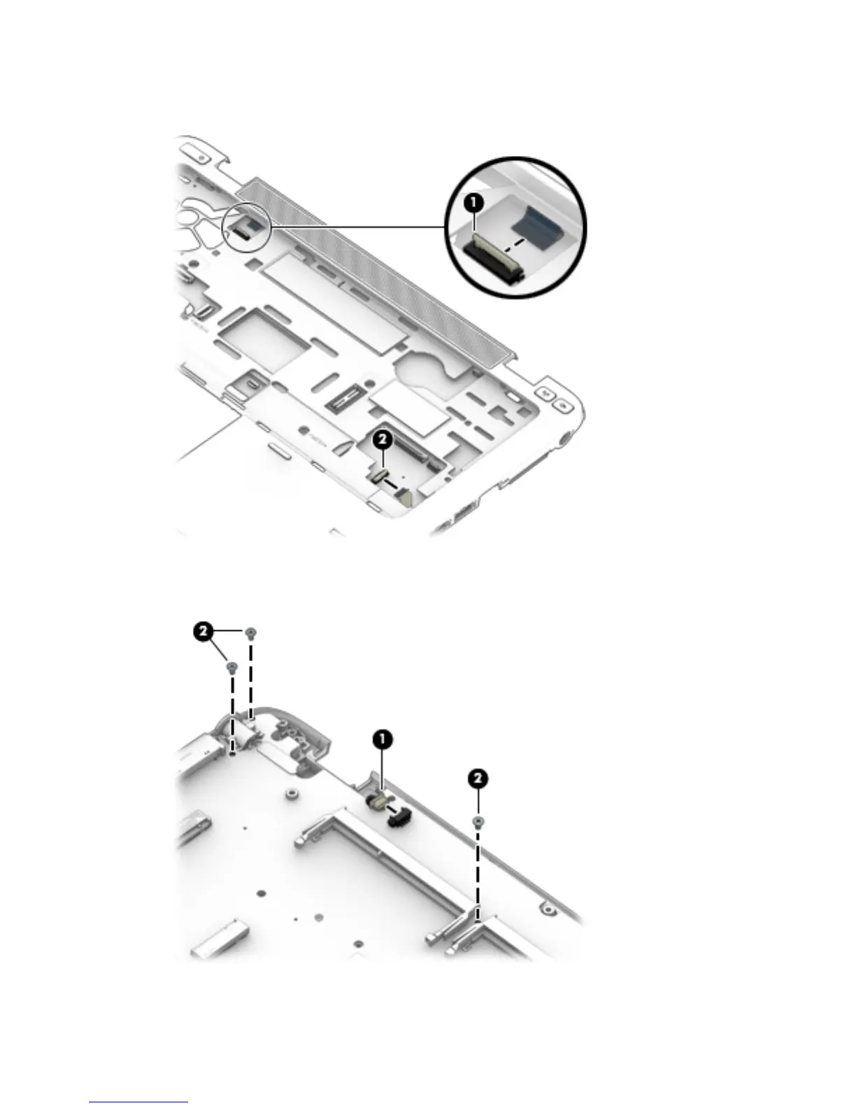 3. Release the ZIF connector (2) to which the fingerprint reader board cable is attached, and then