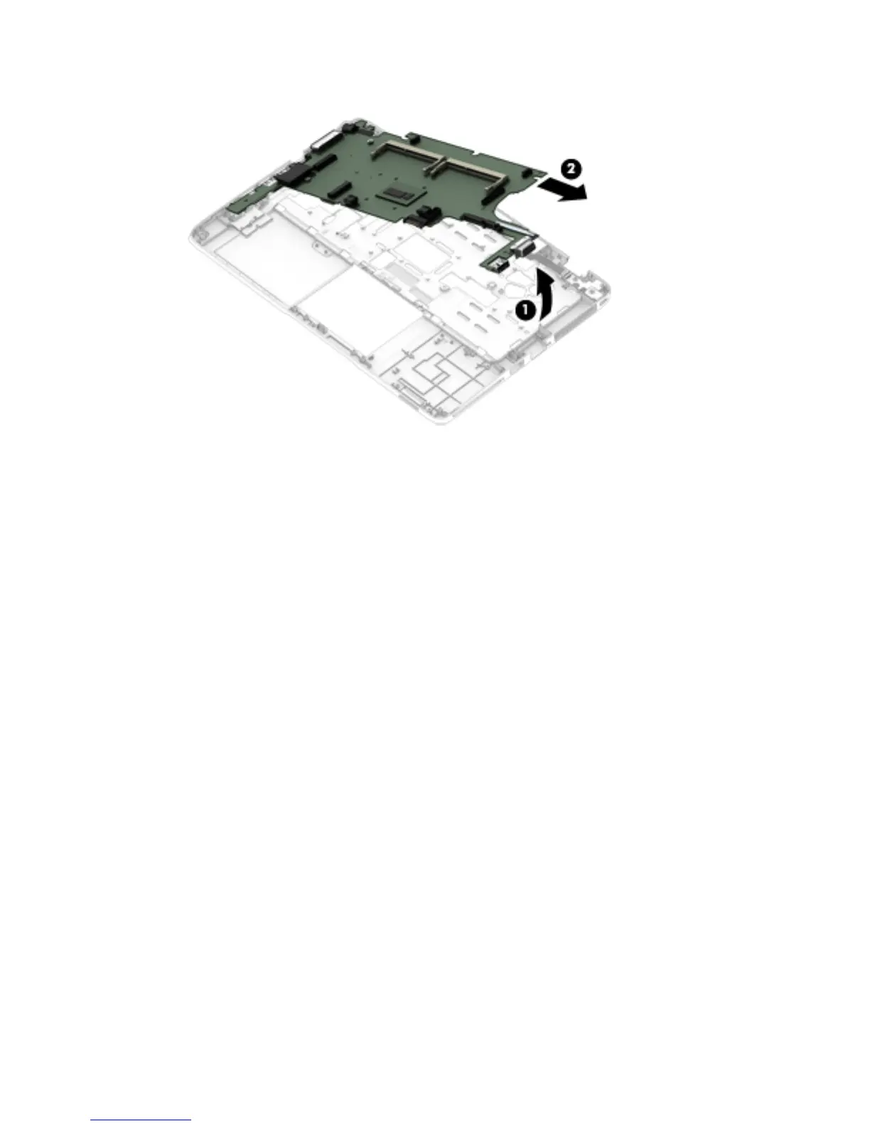 7. Remove the system board (2) by sliding it up and to the right at an angle.