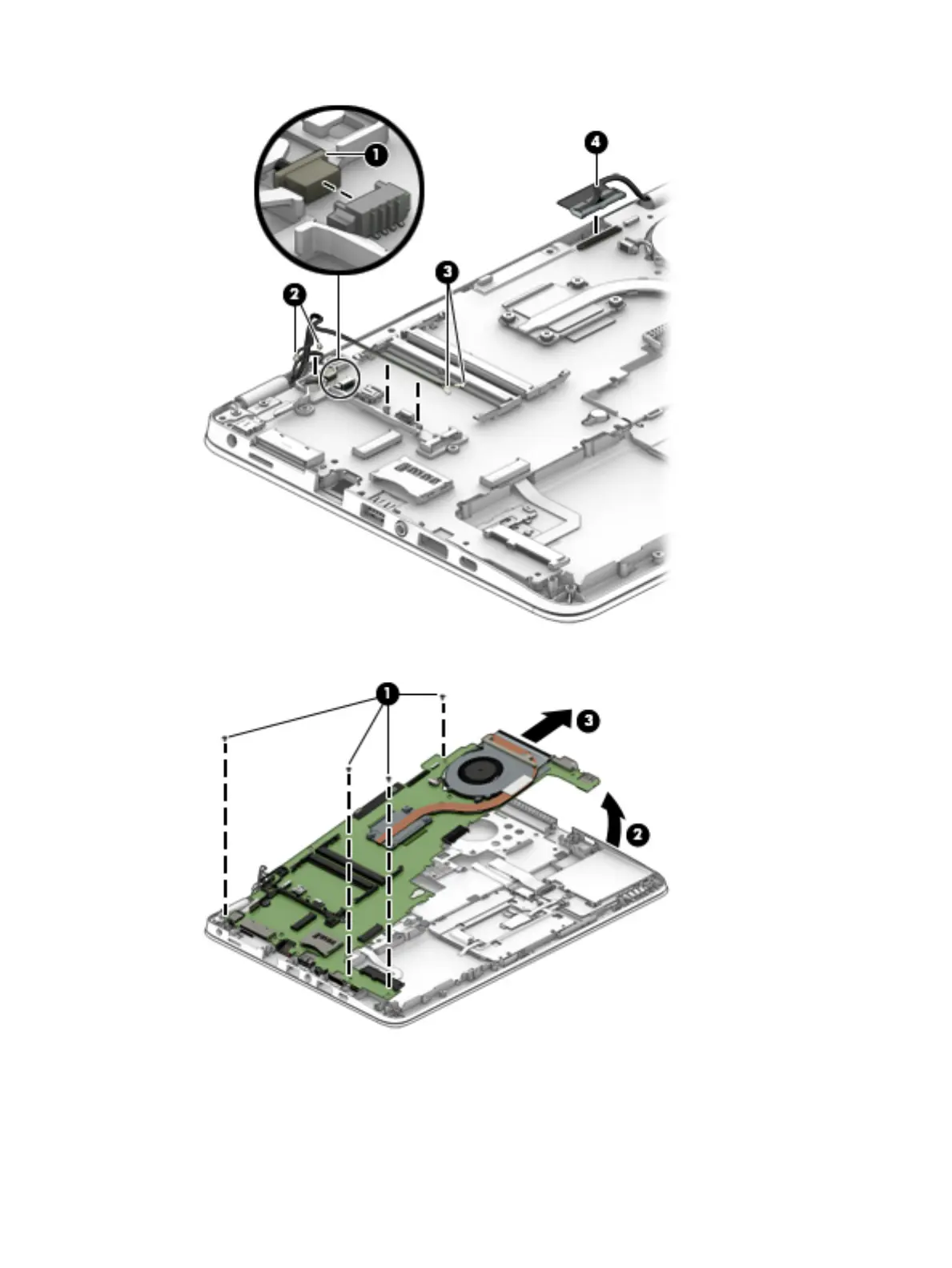 4. Pull the system board up and toward the right to remove it from the computer (3).