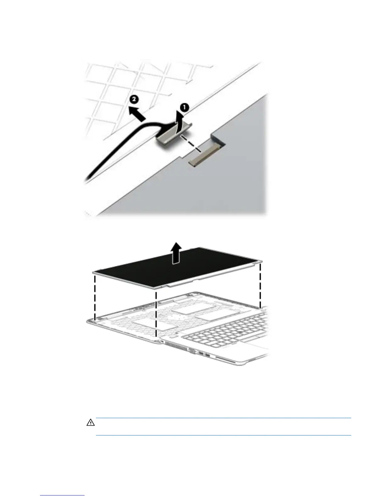 10. Lift the tape that secures the display cable to the display panel (1), and the disconnect the display cable