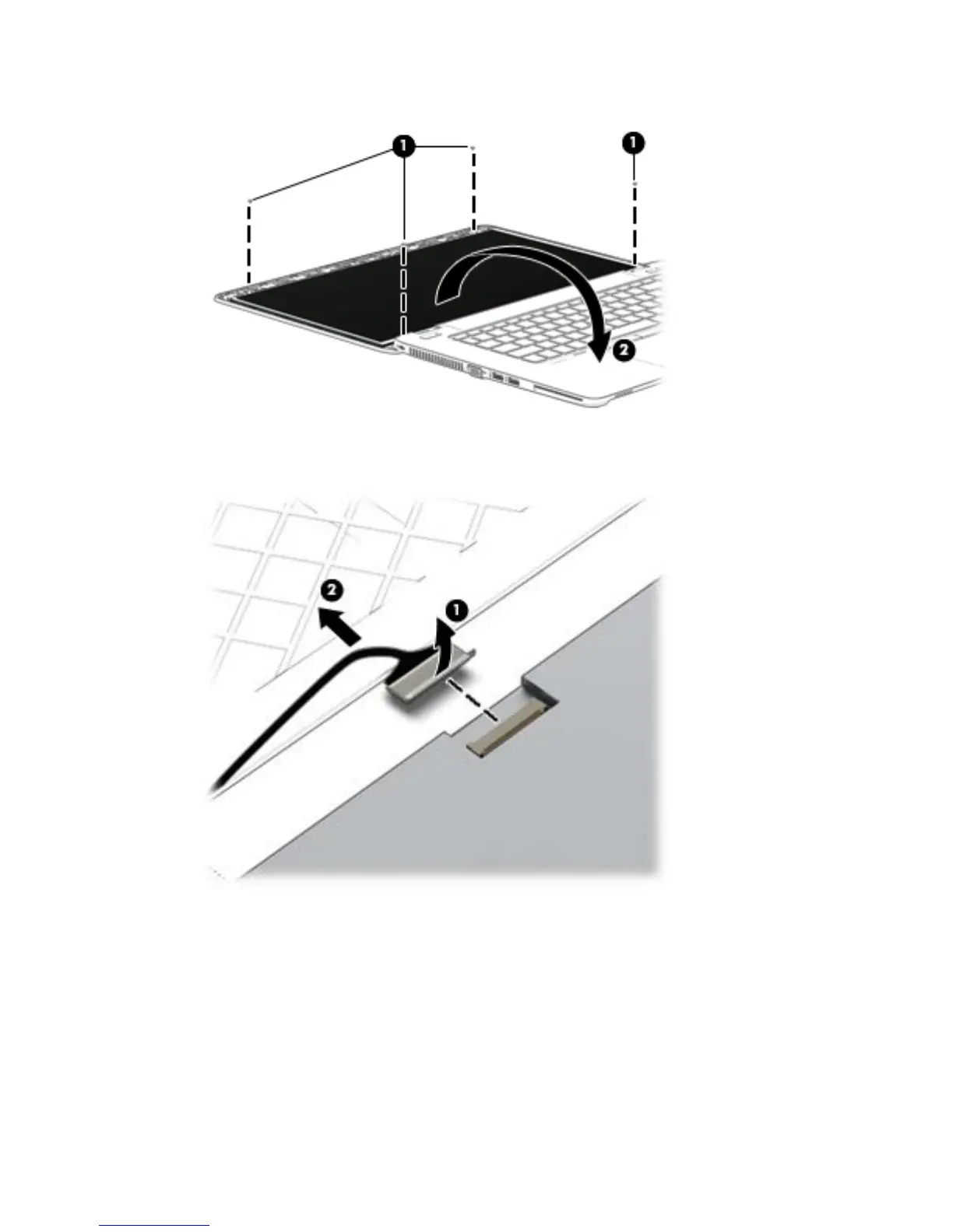5. On the back of the display panel, lift the tape that secures the display cable to the display panel (1), and