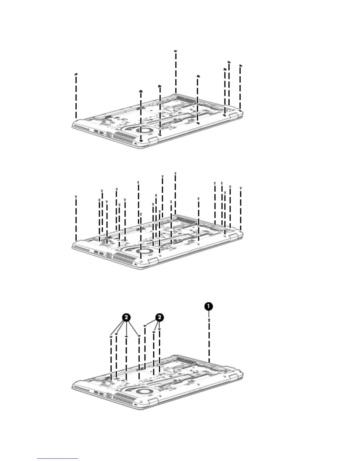 3. Remove the 21 Torx T8M2.5×5.0 screws that secure the internal base enclosure to the computer.
