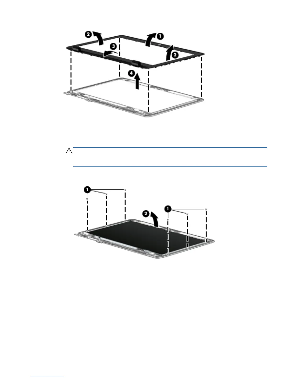 b. Lift the top edge of the display panel (2) and swing it up and forward until it rests upside down in