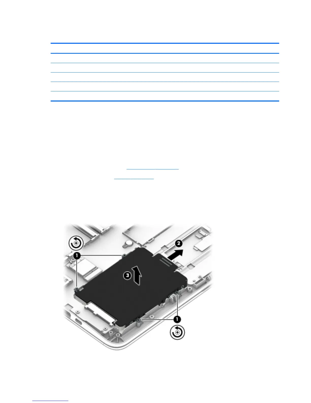 1. Loosen the 4 captive screws (1) that secure the hard drive to the chassis.