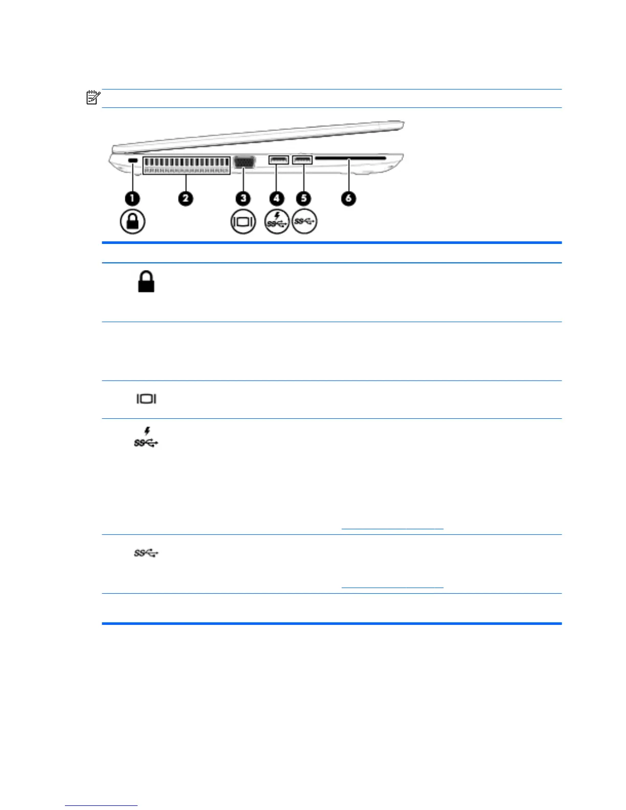 (4) USB 3.0 charging (powered) port Connects an optional USB device, such as a keyboard, mouse,