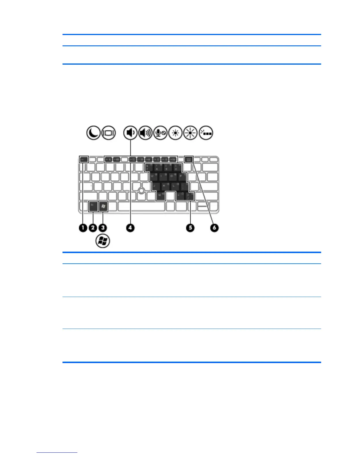 (6) num lk key Turns the embedded numeric keypad on and off when pressed in