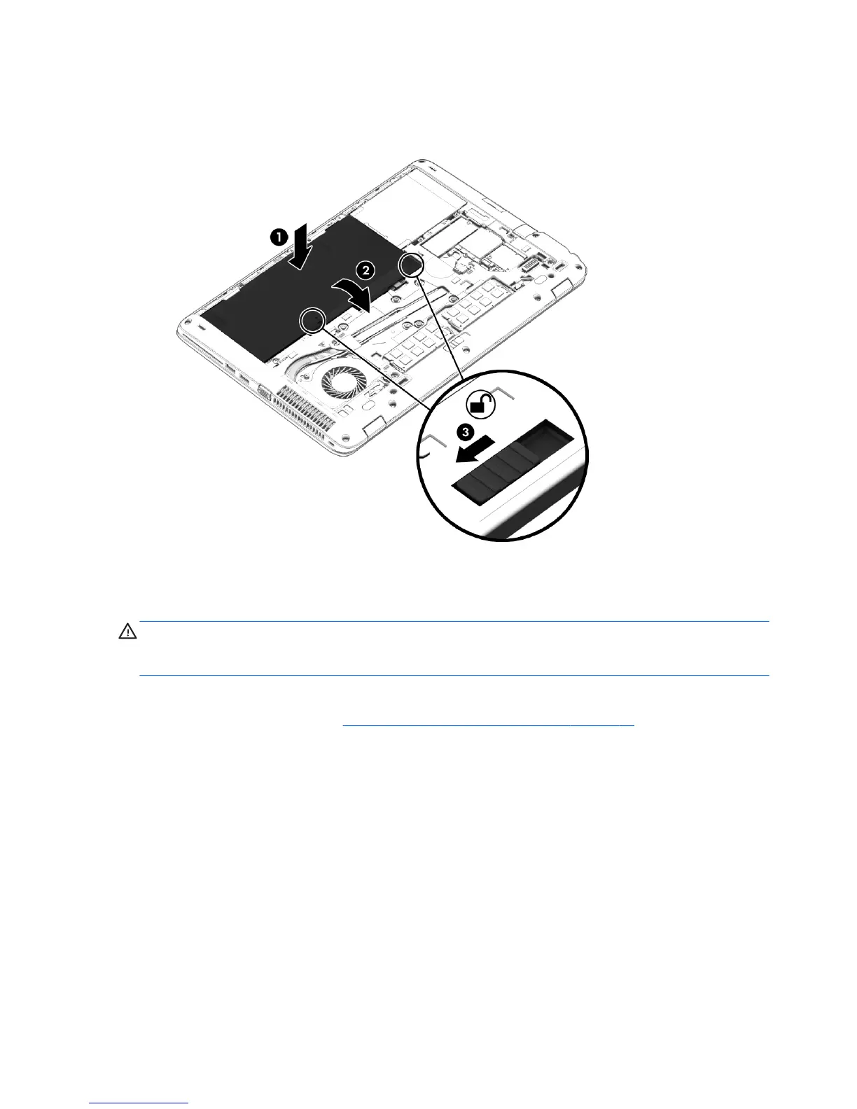 3. Insert the battery (1) into the battery bay at an angle and then press down on the battery (2) until it is