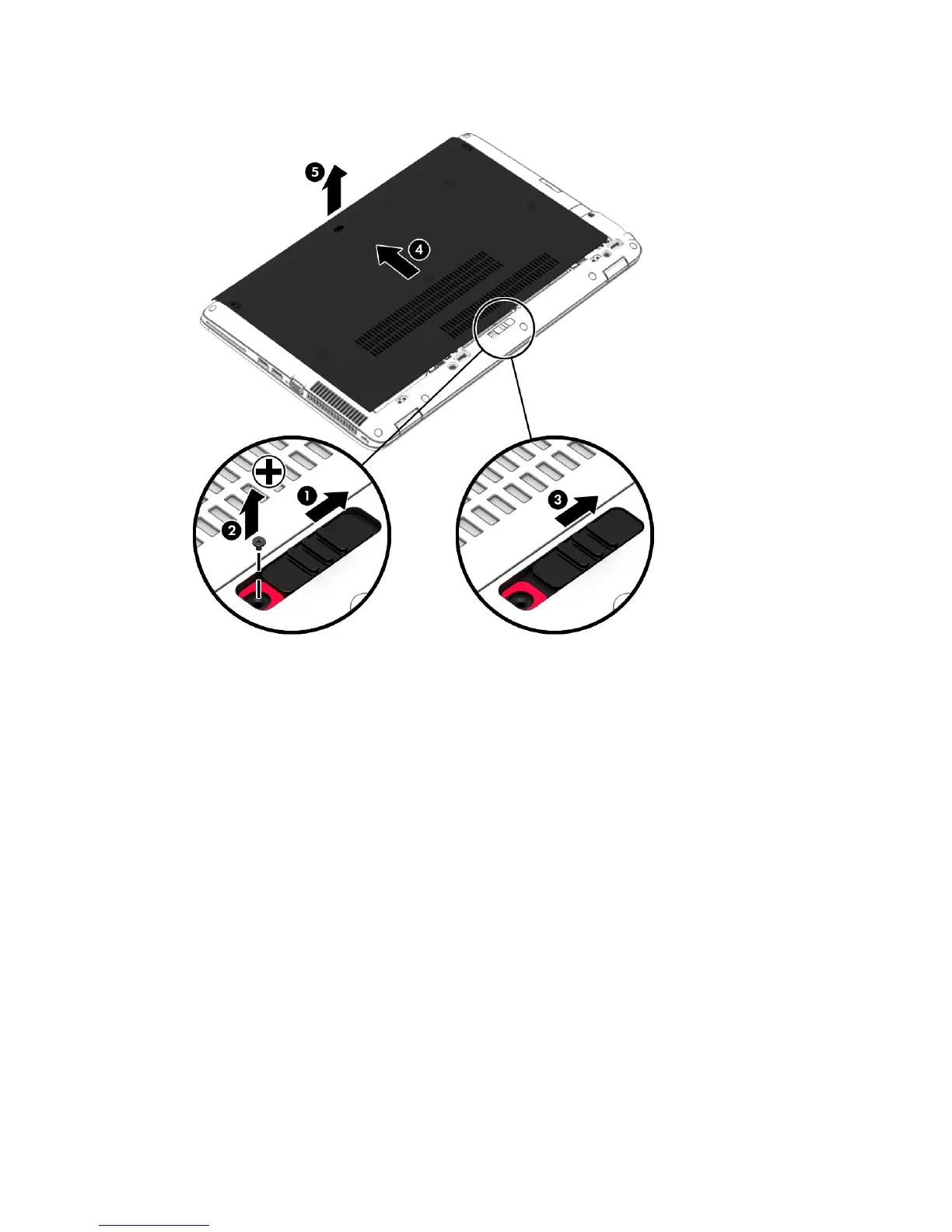 3. Slide the service door toward the front of the computer (4) and lift (5) to remove the service door.