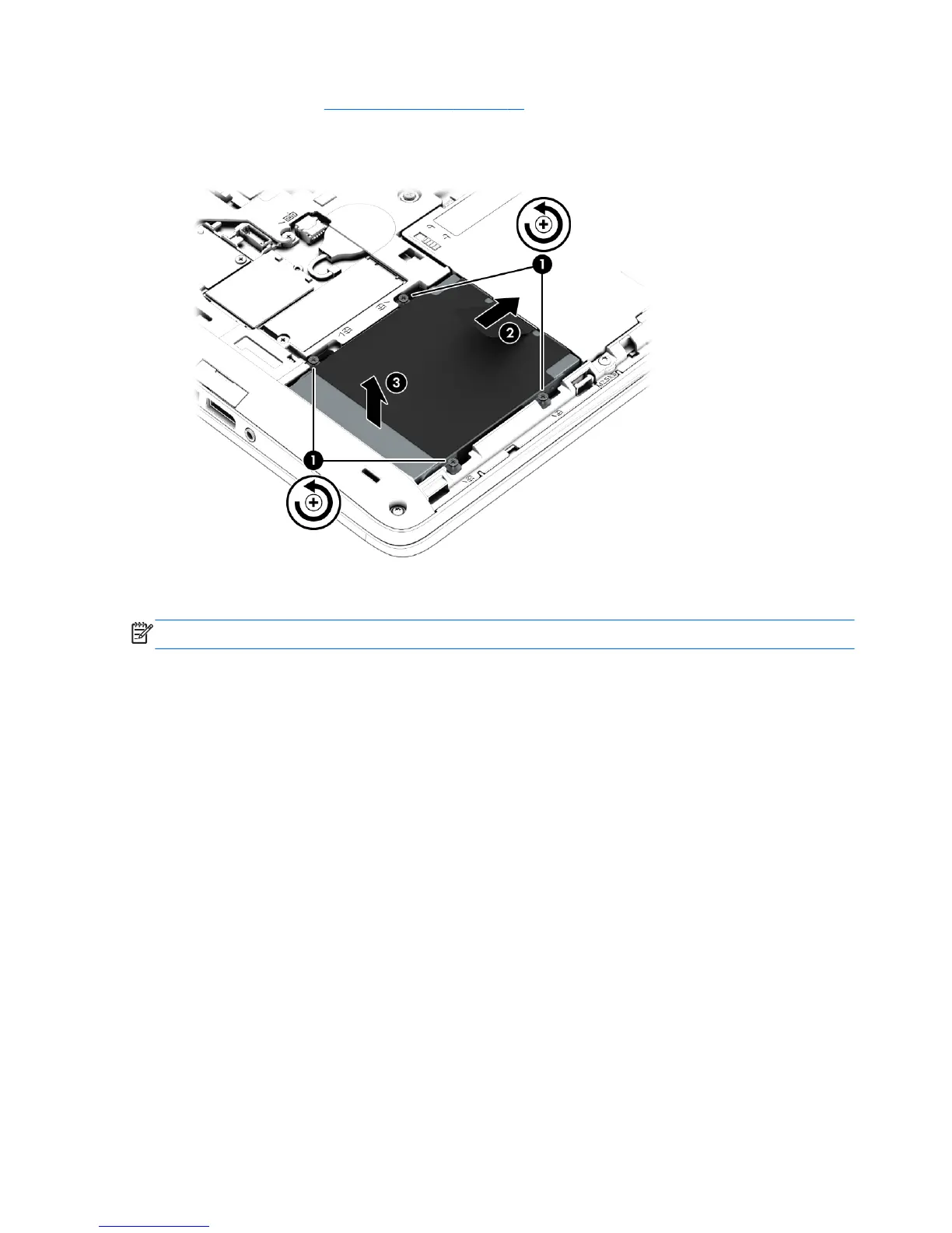 6. Loosen the 4 hard drive cover screws (1). Pull the hard drive tab (2) to disconnect the hard drive.