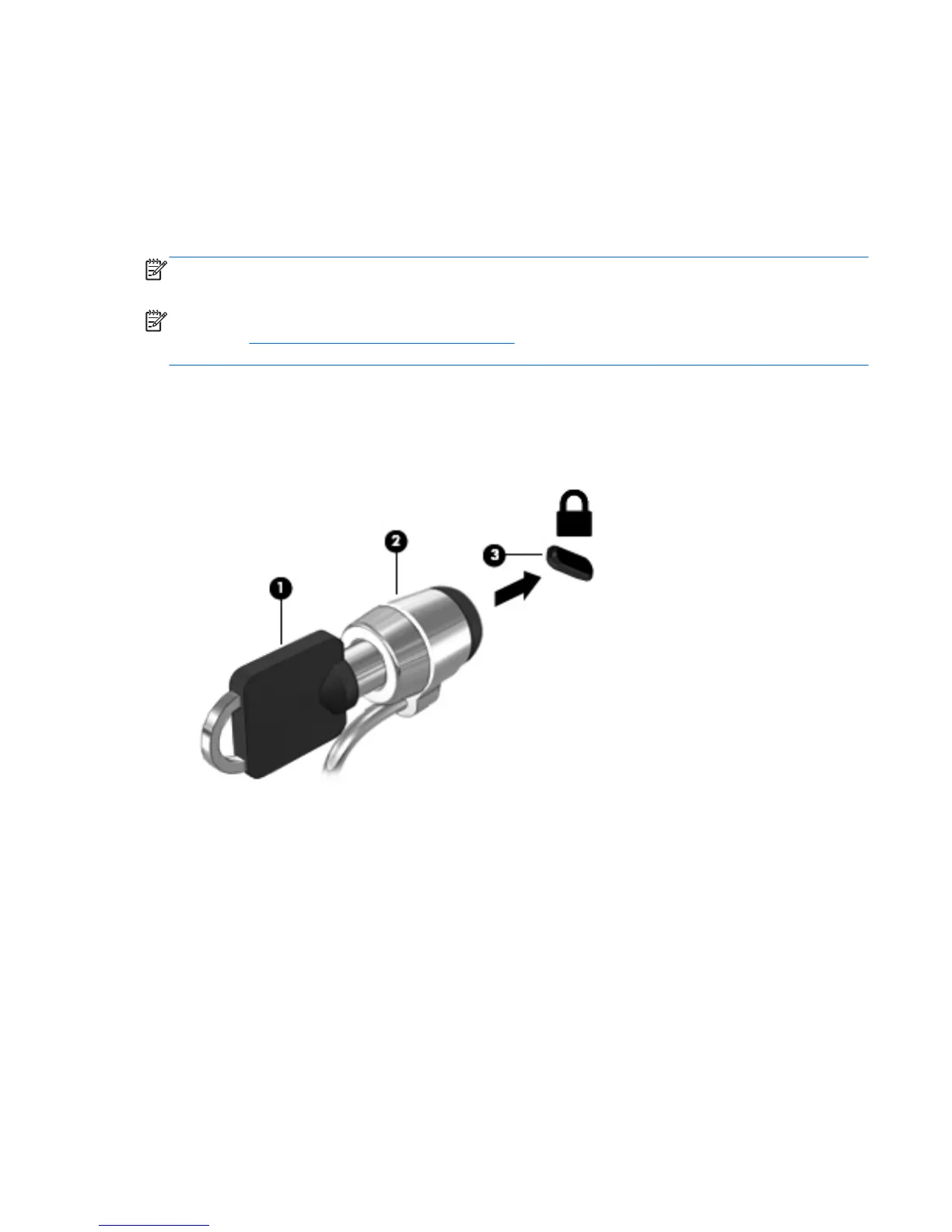 3. Insert the cable lock into the security cable slot on the computer (3), and then lock the cable lock with