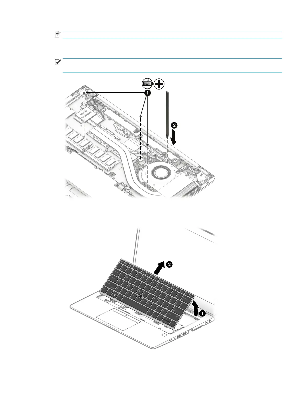 4. Lift to disengage the top of the keyboard (1), and then rotate the keyboard over onto the palm rest (2).