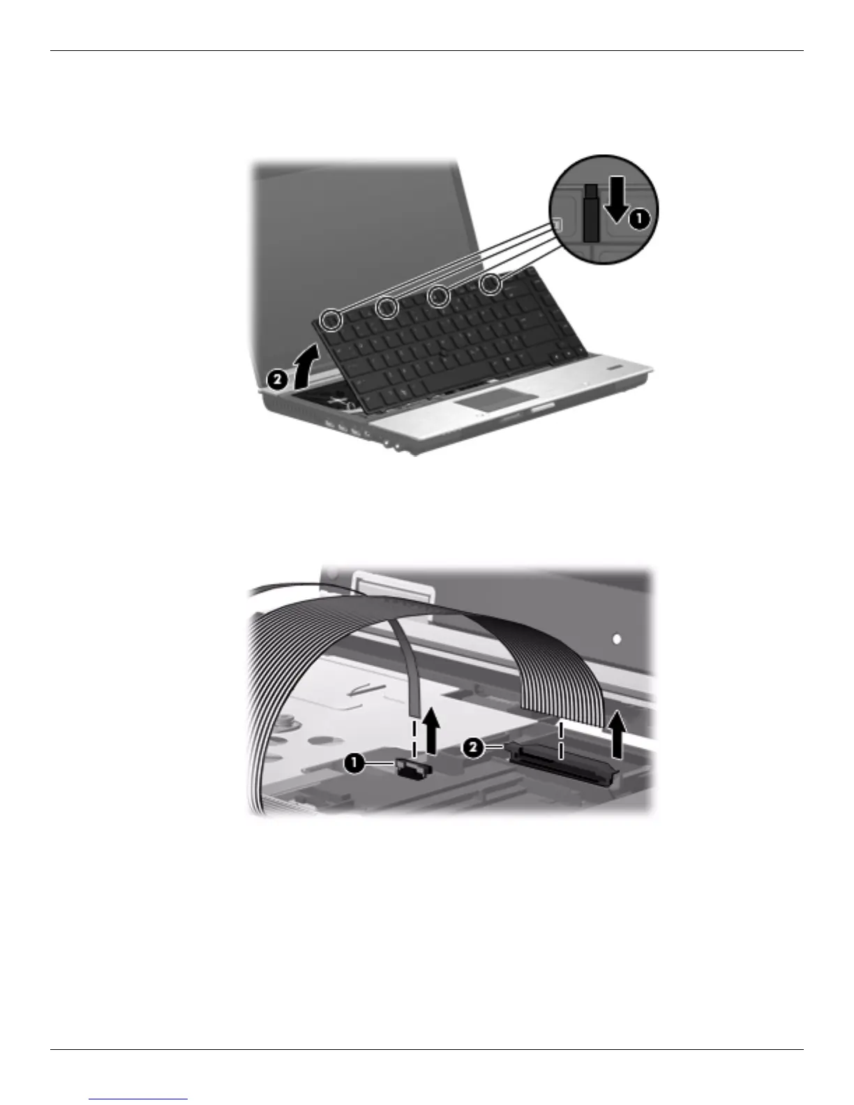6. Lift the rear edge 2 of the keyboard until it rests at an angle, and then turn the keyboard over until it rests on
