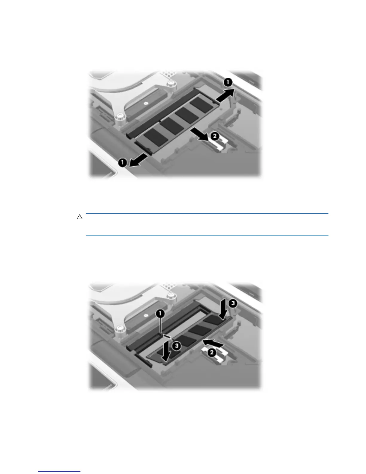 b. Grasp the edge of the memory module (2), and gently pull the module out of the memory