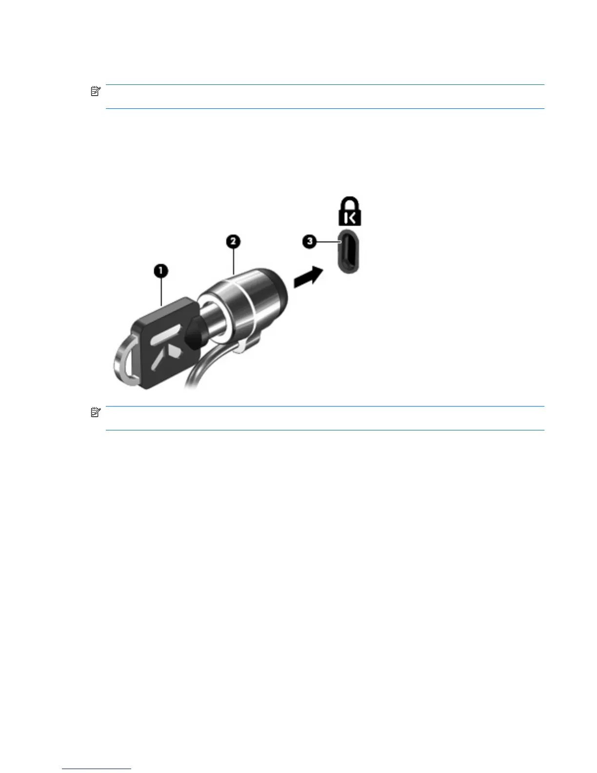 3. Insert the cable lock into the security cable slot on the computer (3), and then lock the cable lock