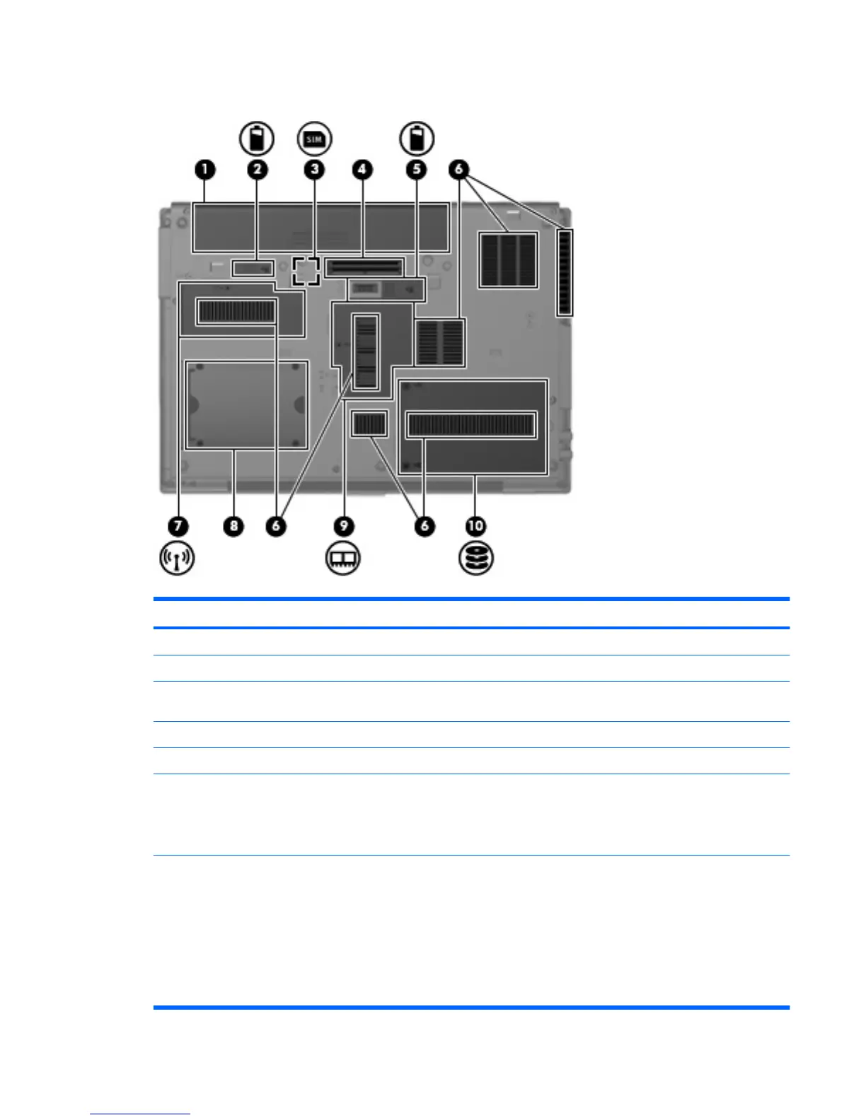 (7) WWAN/WLAN module compartment Contains a WWAN module and a WLAN module (select models