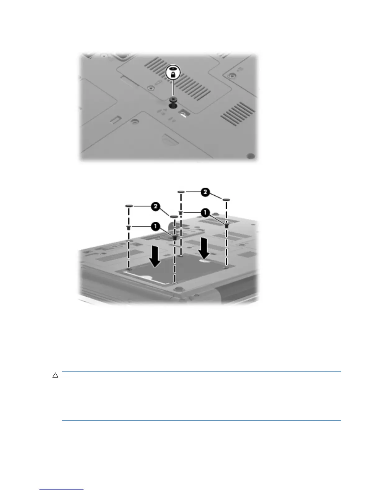 3. Replace the 4 hard drive screws (1), and then replace the protective screw caps (2).