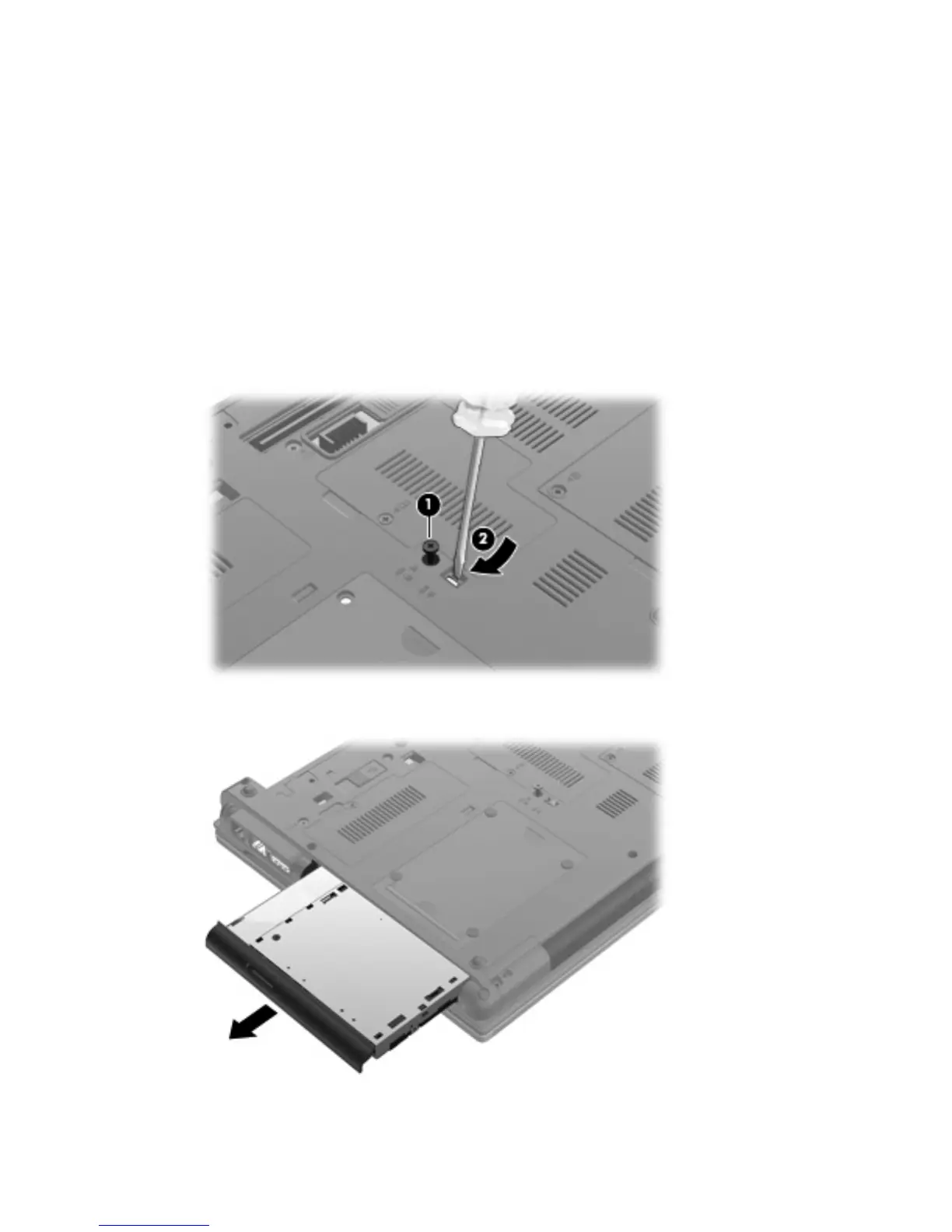 8. Using a flat-bladed screwdriver, gently push the tab to release the optical drive (2).