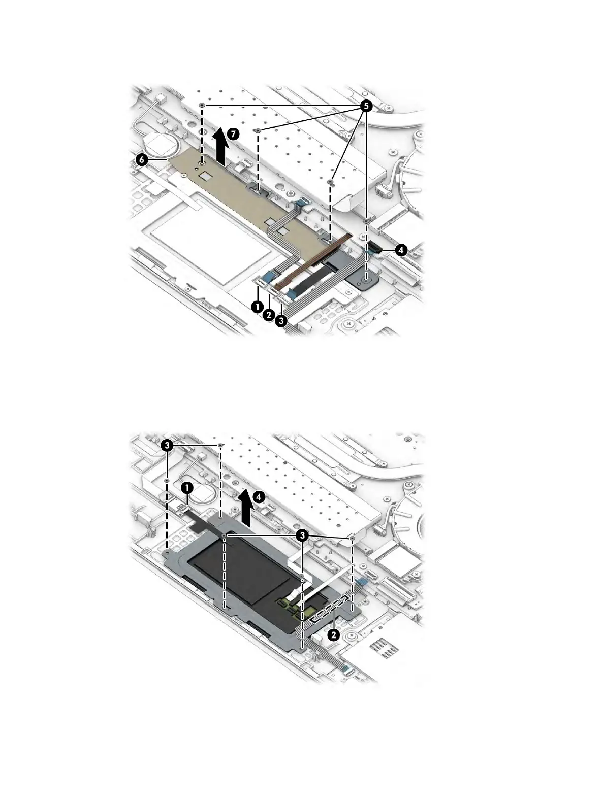 6. Lift the metal tape (6), and then remove the touchpad from the computer (7).